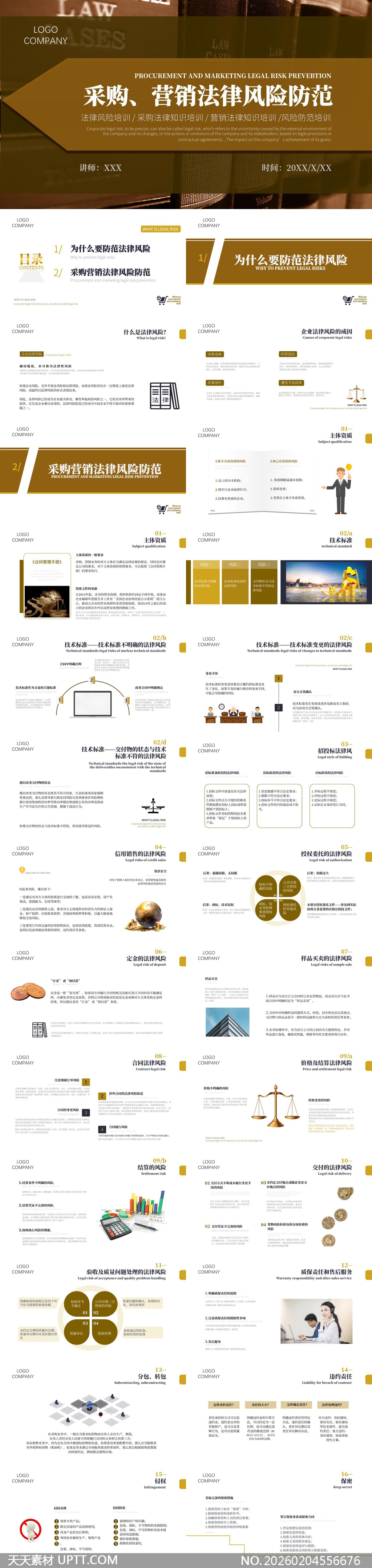本PPT模板采用沉稳大气的金棕配色与法律元素视觉设计,结构清晰、逻辑严谨,涵盖主体资质、技术标准、合同履行、侵权保密等16大核心风险模块,每页均配以图标、流程图、案例示意及要点提炼,兼顾专业性与可读性;适用于企业法务培训、采购营销部门合规宣导、高管风险研讨会及外部法律顾问授课等场景,助力组织系统化识别、评估与应对商业活动中潜在的法律隐患,提升整体合规治理效能。【 素材唯一编号 20260204556676 】,简约类黄色风格PPTX格式素材下载,文件格式为.PPTX,下载完成后的文件为一个压缩包,素材压缩包大小16.07 MB,请解压后用相应软件打开。