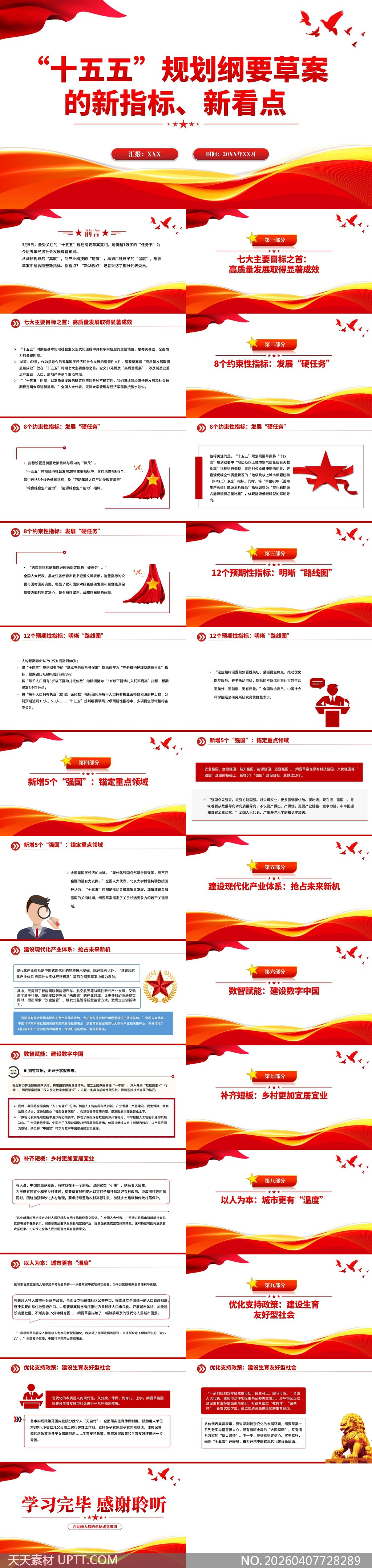 本PPT模板划分为九大核心板块,涵盖高质量发展、硬任务指标、“路线图”预期目标、新增“强国”领域、现代化产业体系、数字中国、乡村振兴、城市温度及生育友好政策等重点内容,适配政府机关、党校培训、高校思政课、企事业单位学习贯彻“十五五”规划纲要的汇报、宣讲与教学场景,兼具权威性、专业性与视觉感染力。【 素材唯一编号 20260407728289 】,党建类红色风格PPTX格式素材下载,文件格式为.PPTX,下载完成后的文件为一个压缩包,素材压缩包大小38.42 MB,请解压后用相应软件打开。