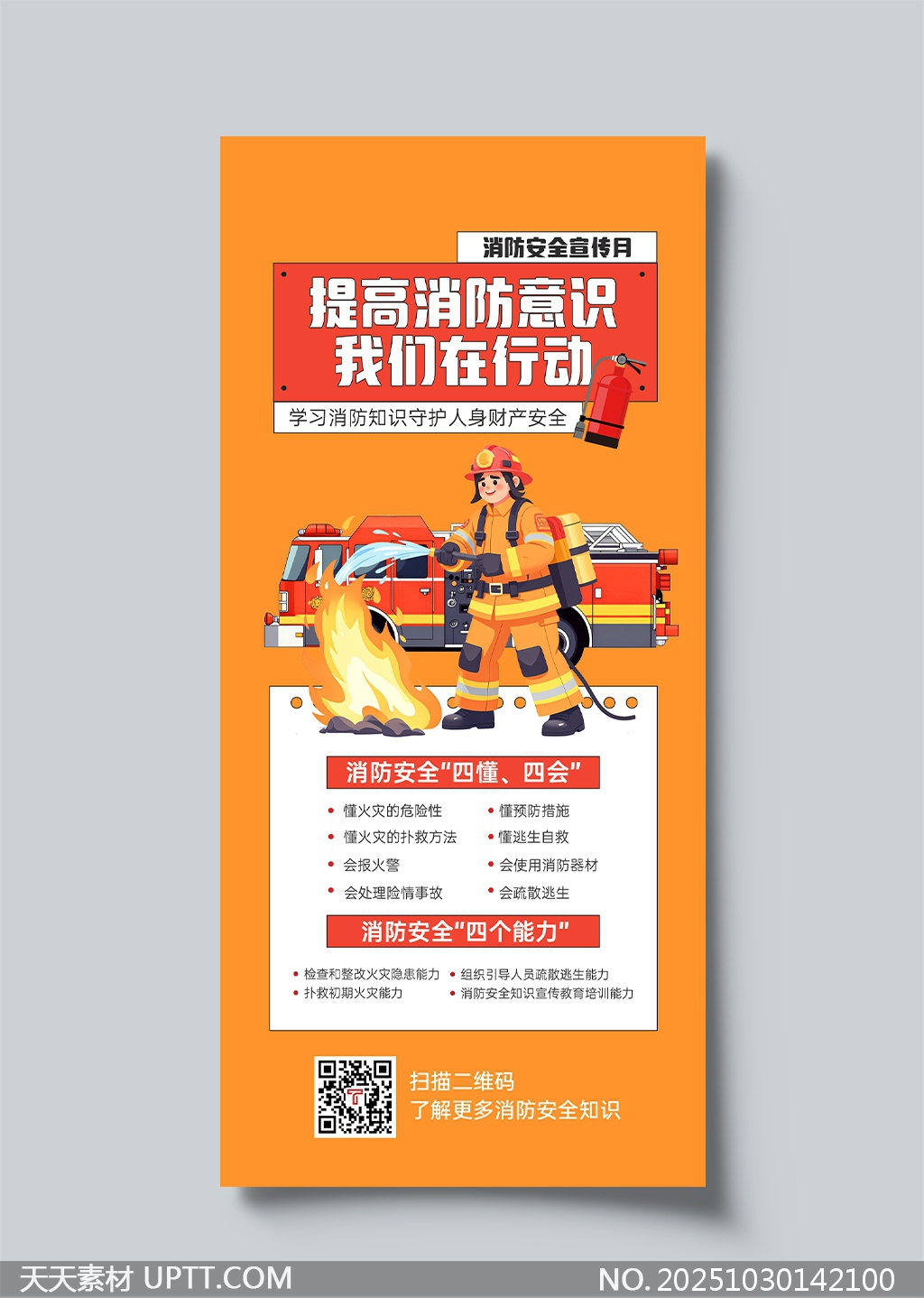 本素材以鲜明橙色为主调,搭配卡通消防员灭火场景,视觉冲击力强,突出消防安全主题;内容涵盖“四懂四会”与“四个能力”核心知识,信息清晰易懂,兼具教育性与传播性;底部二维码设计便于扫码获取更多安全资讯,适用于社区、学校、企事业单位等场所的宣传栏、电子屏或活动展板,助力消防安全知识普及与应急意识提升。【 素材唯一编号 20251030142100 】,海报类橙色风格PSD格式素材下载,文件格式为.PSD,下载完成后的文件为一个压缩包,素材压缩包大小2.44 MB,请解压后用相应软件打开。