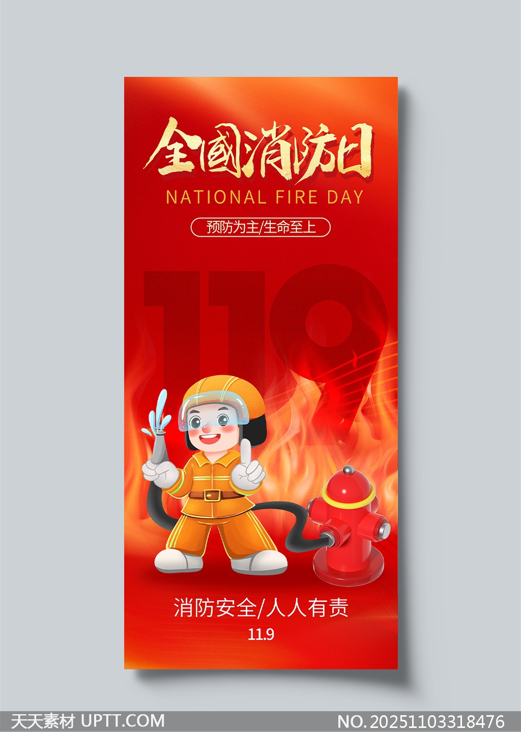 本素材以卡通风格呈现消防员形象,搭配火焰背景与醒目红色主色调,突出全国消防日主题,视觉冲击力强,充满活力与警示意义。画面中消防员手持水枪,身旁设有消防栓,传递专业救援与安全防范理念,配合“预防为主,生命至上”等宣传标语,强化消防安全意识。适用于校园、社区、企事业单位等场所的消防宣传展板、海报张贴或线上推广,兼具趣味性与教育性,助力普及消防知识,营造全民参与的安全氛围。【 素材唯一编号 20251103318476 】,海报类红色风格PSD格式素材下载,文件格式为.PSD,下载完成后的文件为一个压缩包,素材压缩包大小131.52 MB,请解压后用相应软件打开。
