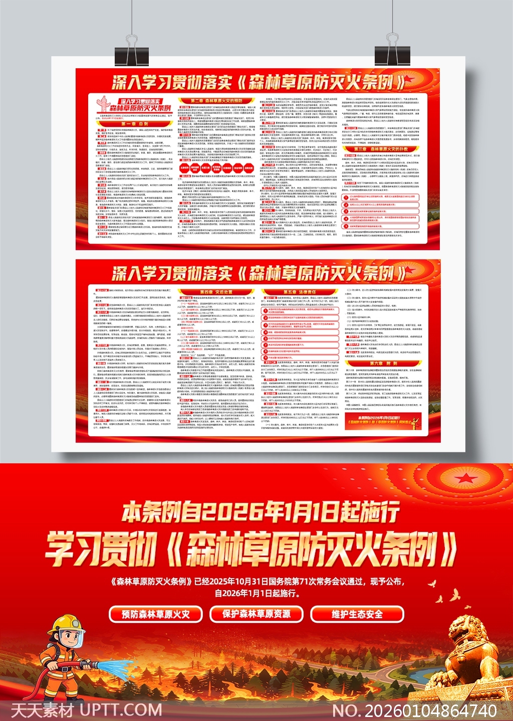 本宣传展板以醒目红色主调与权威图文排版,系统梳理《森林草原防灭火条例》六大核心章节,内容详实、结构清晰、重点突出,兼具政策严肃性与视觉传播力,适用于政府机关、林业单位、社区街道及学校等场所的普法教育与安全警示,是推动法规落地、强化全民防火意识的理想可视化工具,助力构建绿色生态安全防线。【 素材唯一编号 20260104864740 】,展板类红色风格PSD格式素材下载,文件格式为.PSD,下载完成后的文件为一个压缩包,素材压缩包大小78.94 MB,请解压后用相应软件打开。