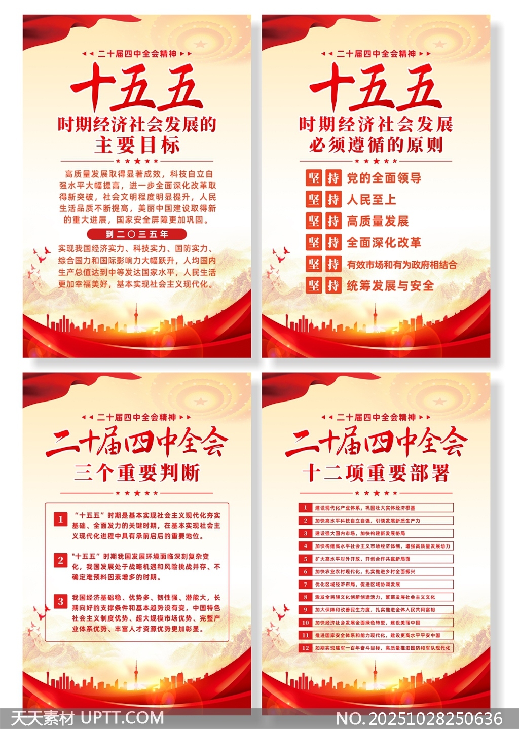 本系列海报以红色为主色调,融合党徽、城市剪影与朝阳元素,视觉庄重大气,突出政治主题的严肃性与时代感,内容涵盖“十五五”发展目标、基本原则、重要判断及十二项部署,信息层次清晰,排版规范严谨,适用于机关单位党建宣传、政策学习培训、展厅布展及主题教育活动场景,助力高效传达会议精神,增强宣传教育感染力与传播效果。【 素材唯一编号 20251028250636 】,海报类红色风格CDR格式素材下载,文件格式为.CDR,下载完成后的文件为一个压缩包,素材压缩包大小9.83 MB,请解压后用相应软件打开。