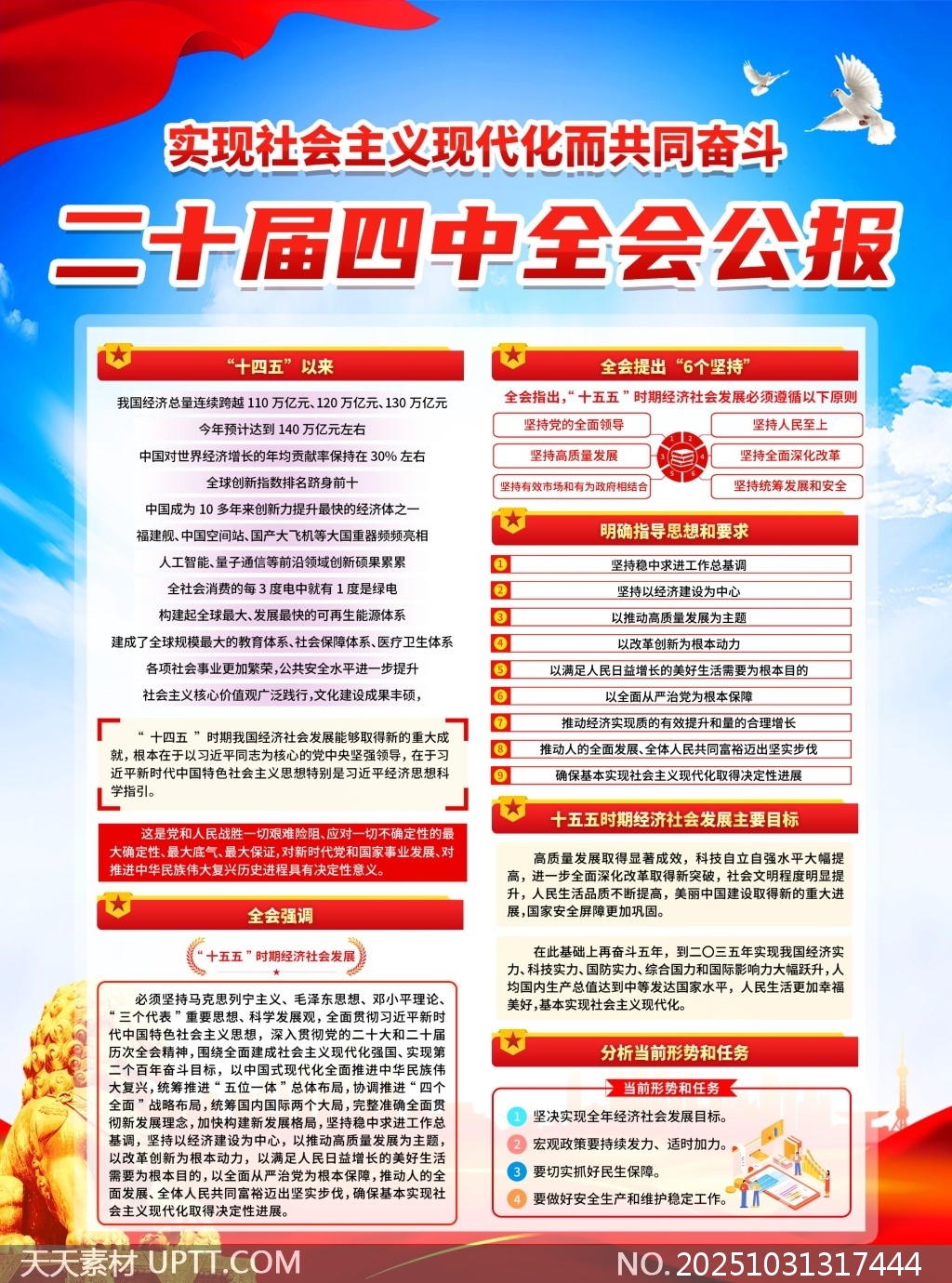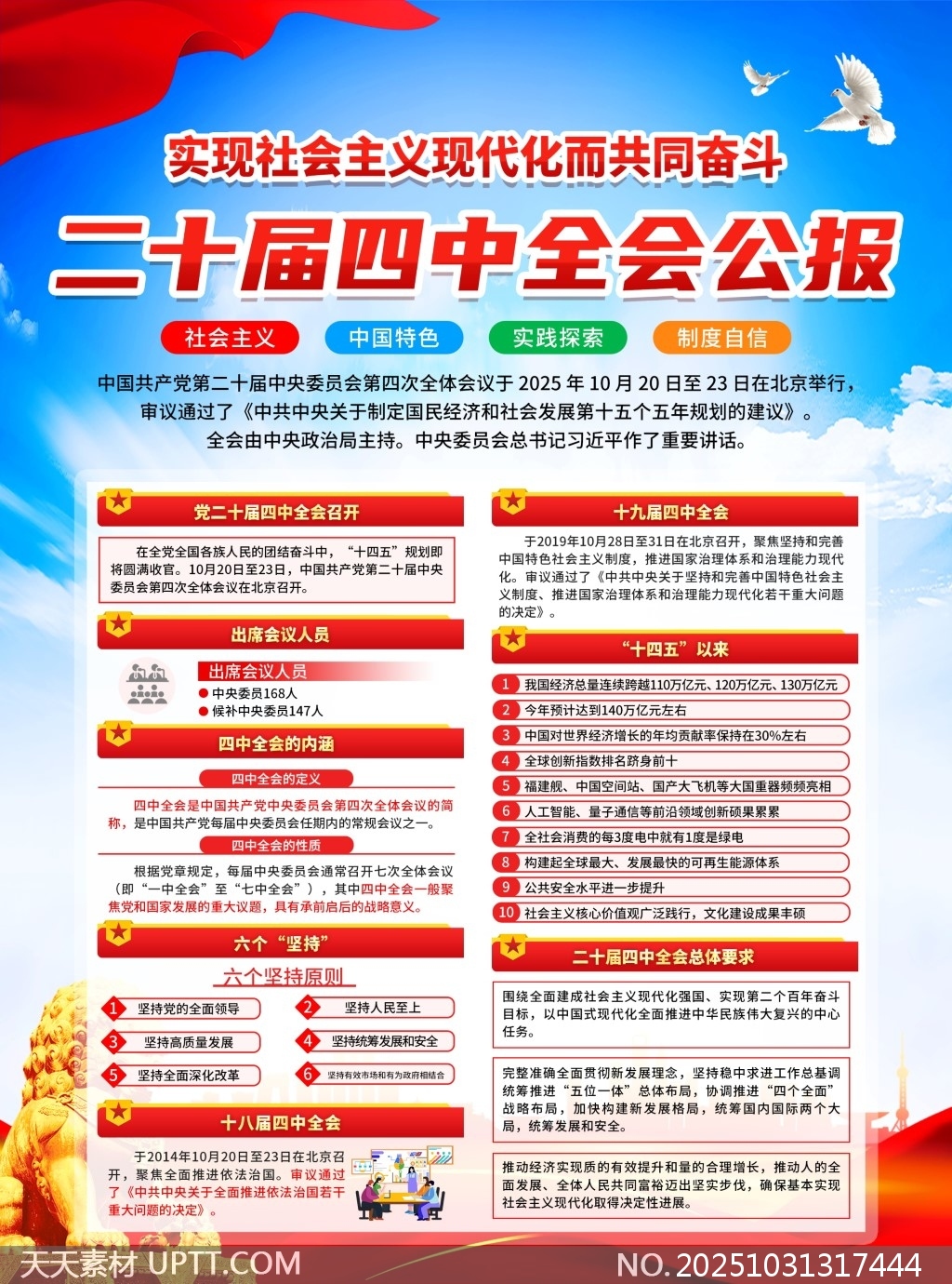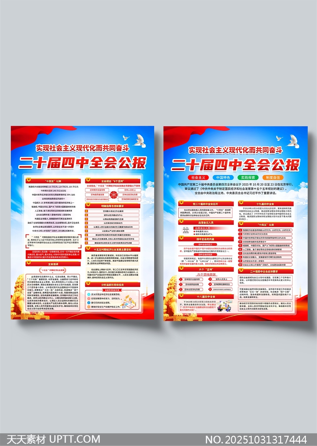 本作品为党建主题宣传二联海报,设计风格庄重大气,采用红蓝主色调搭配祥云、和平鸽等元素,突出政治严肃性与时代感,内容涵盖二十届四中全会核心要点、重点任务及政策解读,图文并茂、结构清晰,适用于机关单位、学校、社区等场所开展政治理论学习、主题党日活动或政策宣贯展示,兼具视觉冲击力与信息传达效率,是高质量党建宣传素材的优选。【 素材唯一编号 20251031317444 】,展板类红色风格PSD格式素材下载,文件格式为.PSD,下载完成后的文件为一个压缩包,素材压缩包大小37.99 MB,请解压后用相应软件打开。