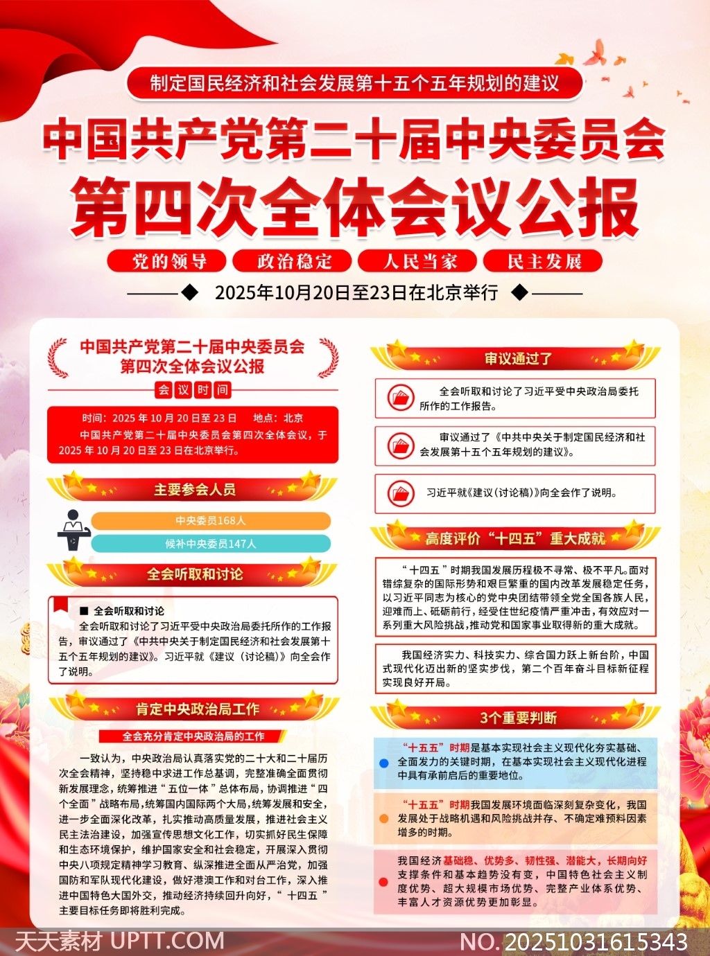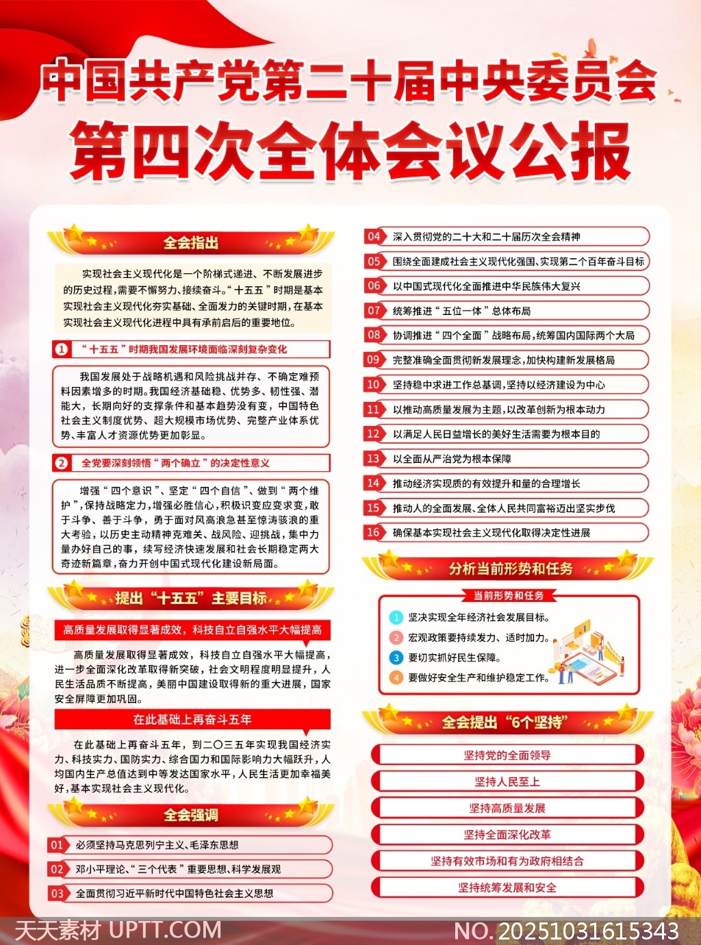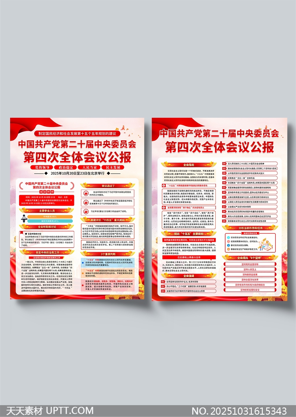 本素材为党的二十届四中全会公报内容解读二联海报,采用红金主色调搭配大气排版设计,突出政治主题的庄重感与时代感,信息层次清晰、重点突出,融合图文并茂的呈现方式,便于快速理解核心要点。适用于机关单位、学校、社区等开展政策学习宣传、主题党日活动、党建展板布置及会议材料展示,兼具实用性与视觉冲击力,是高效传达会议精神的理想设计素材。【 素材唯一编号 20251031615343 】,海报类红色风格PSD格式素材下载,文件格式为.PSD,下载完成后的文件为一个压缩包,素材压缩包大小67.57 MB,请解压后用相应软件打开。