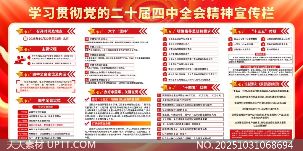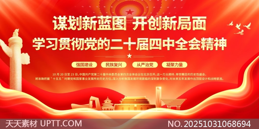 本作品以红色为主色调,融合党徽、华表、天安门等经典元素,整体设计庄重大气、层次分明,突出政治主题的严肃性与时代感,采用现代化排版布局,内容分区清晰,信息传达高效,适用于机关单位、企事业单位、学校等场所的党建宣传栏、展厅展板及会议背景墙展示,助力深入学习贯彻党的二十届四中全会精神,营造浓厚的学习氛围。【 素材唯一编号 20251031068694 】,展板类红色风格PSD格式素材下载,文件格式为.PSD,下载完成后的文件为一个压缩包,素材压缩包大小159.43 MB,请解压后用相应软件打开。