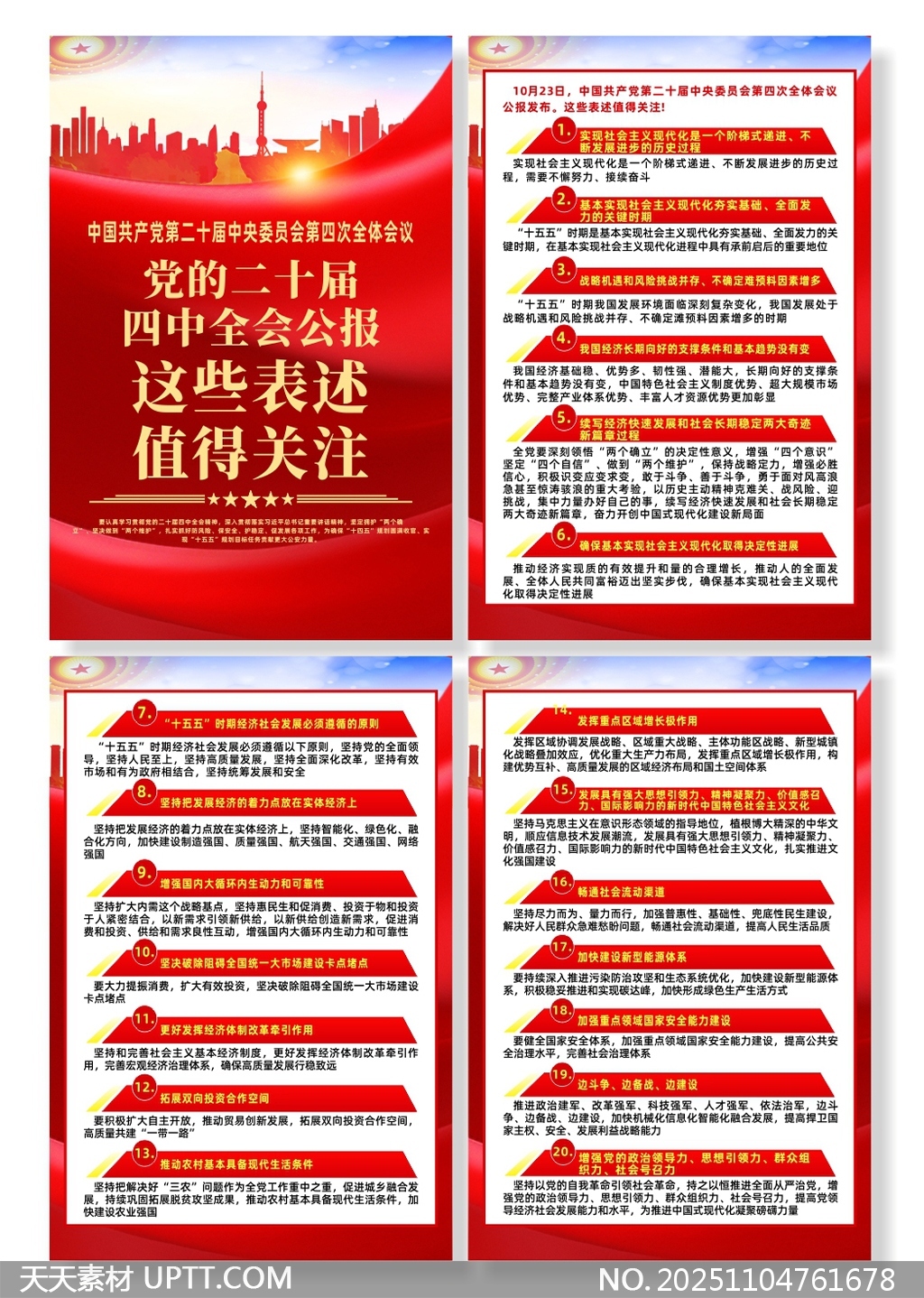 本素材以红色为主色调,融合党徽、城市剪影等元素,设计风格庄重大气,突出政治主题的严肃性与时代感,采用清晰分点排版,重点提炼二十届四中全会公报核心表述,便于快速阅读与理解,适用于党政机关、企事业单位宣传展板、学习会议背景图、党建活动海报等场景,兼具视觉冲击力与信息传达效率,是开展政策解读和主题教育的理想设计资源。【 素材唯一编号 20251104761678 】,海报类红色风格CDR格式素材下载,文件格式为.CDR,下载完成后的文件为一个压缩包,素材压缩包大小17.94 MB,请解压后用相应软件打开。