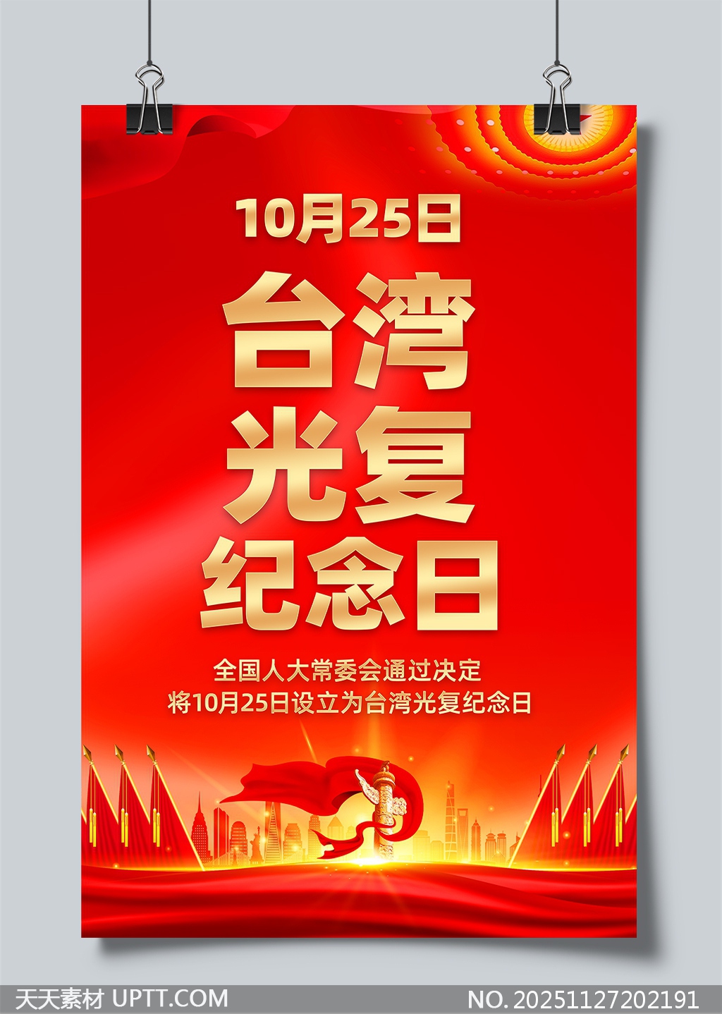 该海报以“台湾光复纪念日”为主题,纪念10月25日这一重要历史时刻。整体色彩庄重而鲜明,以红色为主色调,象征着爱国热情与历史的厚重感,搭配金色元素,彰显庄严与辉煌。设计风格简洁大气,文字排版清晰,重点突出全国人大常委会通过设立纪念日的决定,传递出强烈的纪念意义与历史责任感,给人以强烈的视觉冲击和深刻的情感共鸣,适合用于历史纪念、爱国主义教育等相关主题的设计创作。【 素材唯一编号 20251127202191 】,海报类红色风格PSD格式素材下载,文件格式为.PSD,下载完成后的文件为一个压缩包,素材压缩包大小23.6 MB,请解压后用相应软件打开。