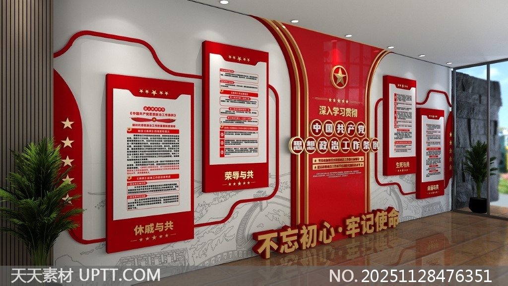 该党建文化墙设计以红色为主色调,融合金色线条与党徽元素,整体造型大气庄重,突出政治性与时代感,中央主题板块醒目展示“深入学习贯彻中国共产党思想政治工作条例”核心内容,四周配以“休戚与共、荣辱与共、生死与共、命运与共”四大板块,结构清晰、层次分明,底部“不忘初心·牢记使命ission”标语强化思想引领,适用于机关单位、企事业单位党建阵地、党员活动室、展厅等场景,兼具宣传性与艺术性,助力营造浓厚的党建文化氛围。【 素材唯一编号 20251128476351 】,文化墙类红色风格CDR格式素材下载,文件格式为.CDR,下载完成后的文件为一个压缩包,素材压缩包大小4.47 MB,请解压后用相应软件打开。