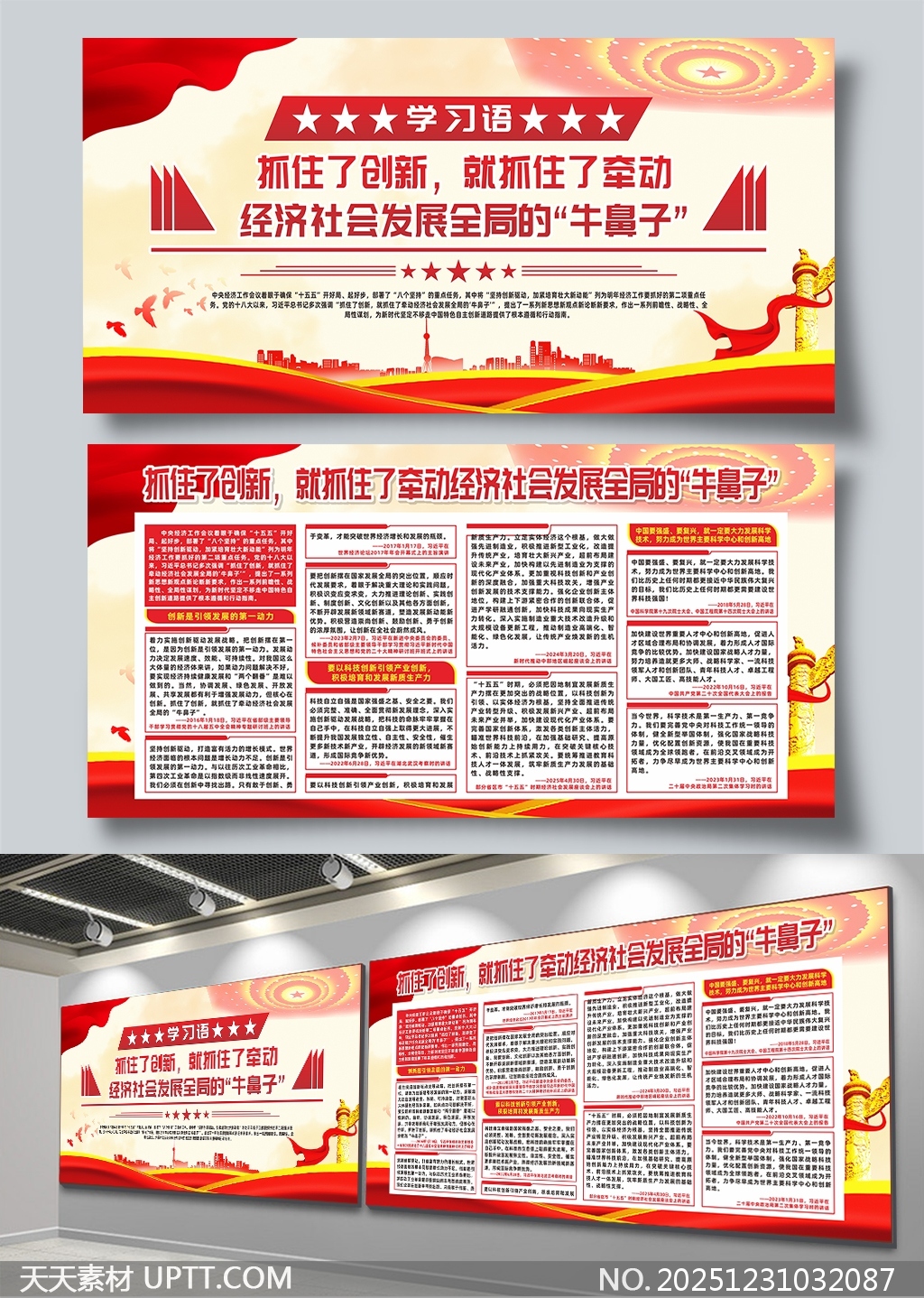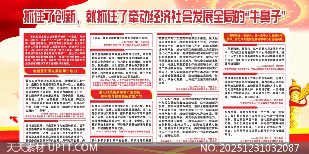 本展板以鲜明的红色主调与金色元素营造庄重热烈的党建氛围,融合城市剪影、飘带与华表等视觉符号强化时代感与国家形象,核心标语“抓住了创新,就抓住了牵动经济社会发展全局的‘牛鼻子’”突出主题,内容板块清晰分列政策解读与实践指导,适用于党政机关、企事业单位的政策宣传栏、主题教育展厅及大型会议背景墙,兼具权威性与视觉冲击力,是高效传达创新引领发展理念的理想宣传载体。【 素材唯一编号 20251231032087 】,展板类红色风格CDR格式素材下载,文件格式为.CDR,下载完成后的文件为一个压缩包,素材压缩包大小14.2 MB,请解压后用相应软件打开。