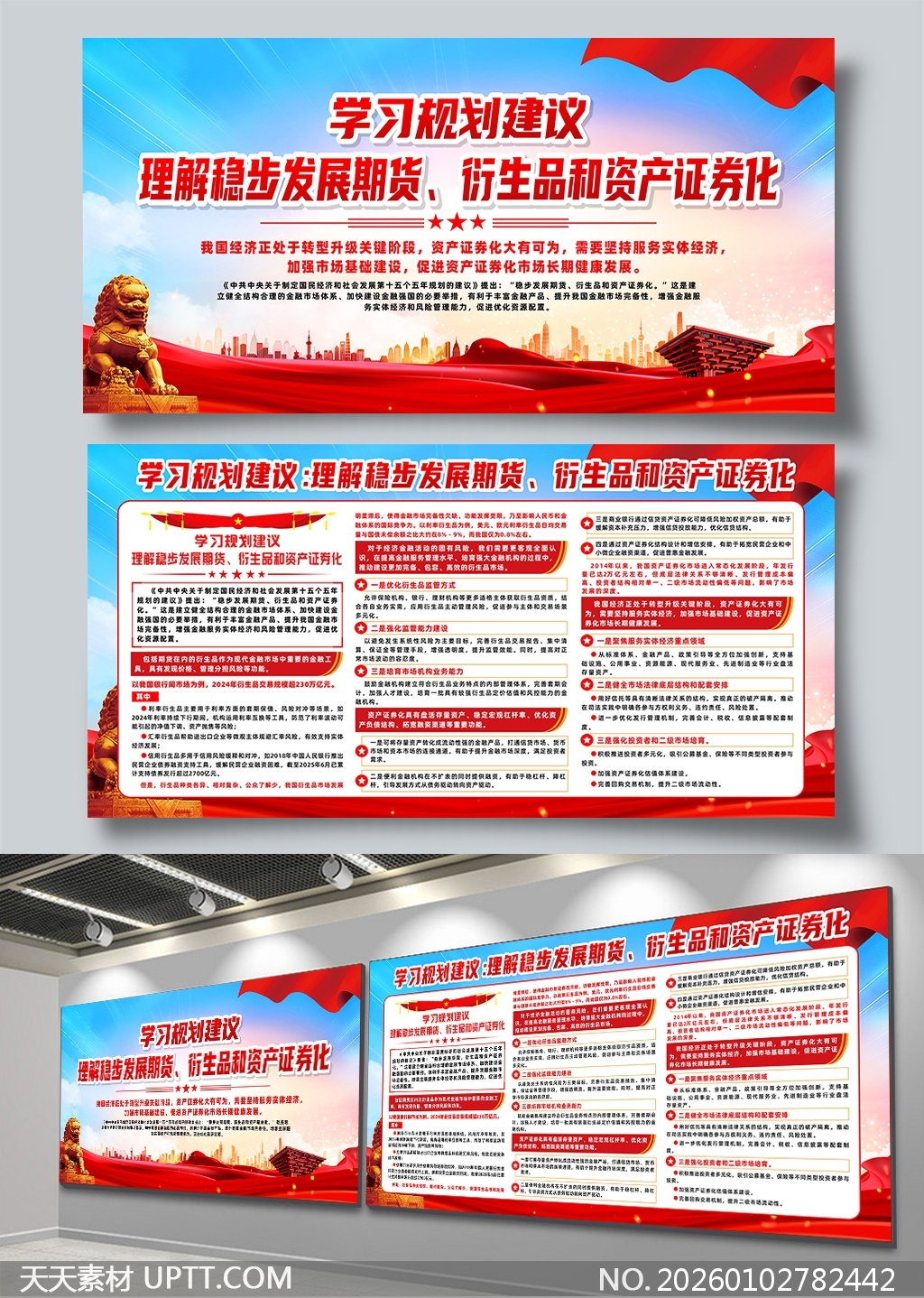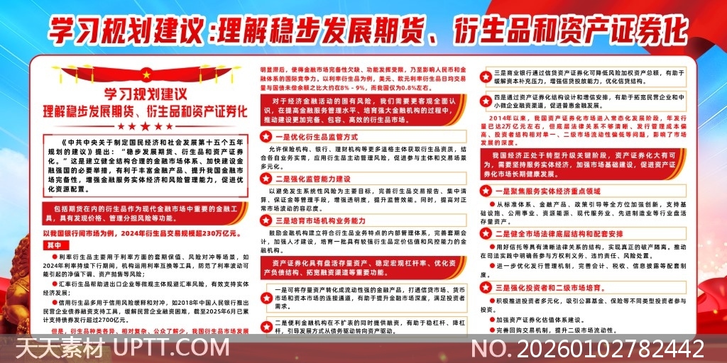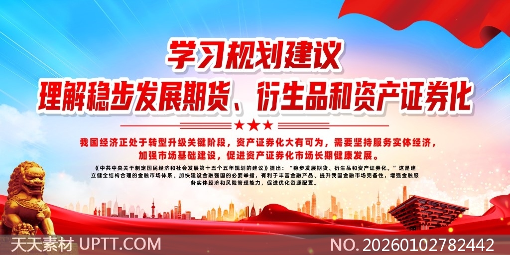 本展板以红蓝主色调搭配金色石狮与城市剪影,视觉庄重且富有现代感,内容结构清晰、图文并茂,精准传达金融政策导向与市场发展路径,适用于金融机构内部培训、行业峰会布展或政府经济宣传场景,助力用户高效传递期货衍生品与资产证券化领域的专业规划与战略部署。【 素材唯一编号 20260102782442 】,展板类红色风格CDR格式素材下载,文件格式为.CDR,下载完成后的文件为一个压缩包,素材压缩包大小36.66 MB,请解压后用相应软件打开。