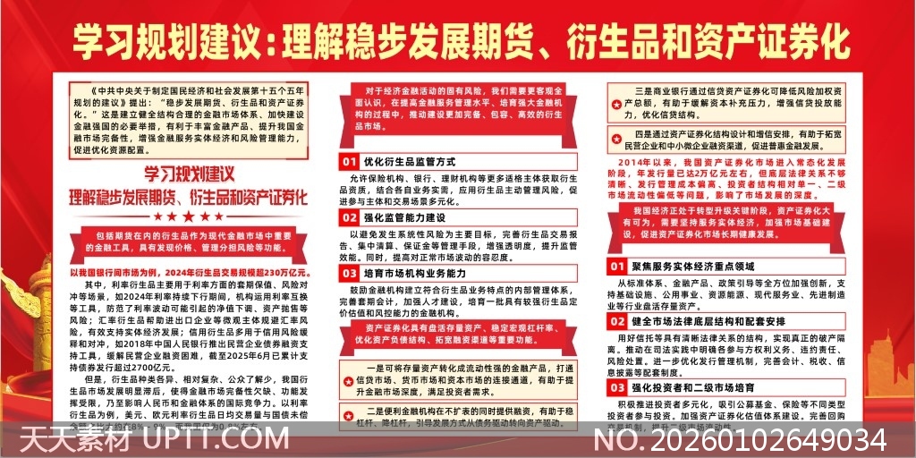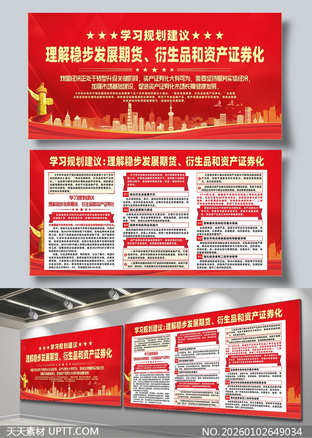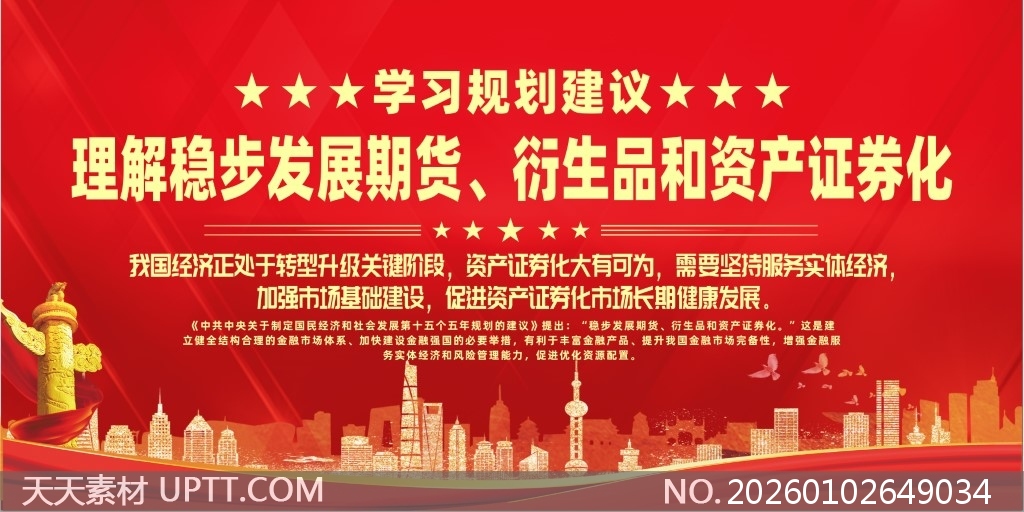 本展板以醒目红色主调搭配金色城市剪影与华表元素,视觉庄重且富有政策高度,内容结构化呈现“学习规划建议”核心要点,分模块详解期货、衍生品及资产证券化发展路径,适用于金融机构党建宣传、政策解读会议或企业内训场景,助力快速传达金融改革方向与合规发展思路,是提升专业形象与政策落地效率的理想视觉工具。【 素材唯一编号 20260102649034 】,展板类红色风格CDR格式素材下载,文件格式为.CDR,下载完成后的文件为一个压缩包,素材压缩包大小40.7 MB,请解压后用相应软件打开。
