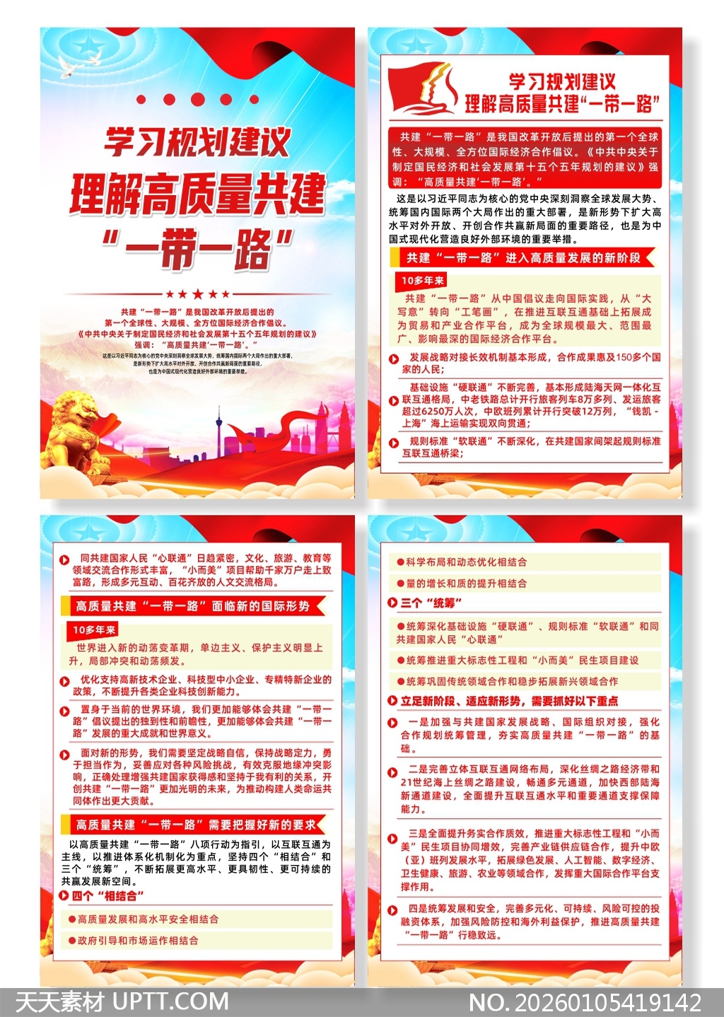 本系列海报以鲜明的红蓝主色调与祥云、石狮等传统元素融合,视觉冲击力强且庄重大气,内容结构清晰分模块呈现“一带一路”高质量共建的核心要义与战略路径,适合作为党政机关、高校思政课堂、企业党建展厅及国际交流活动中的宣传展板或数字屏显素材,助力政策解读与思想传播,兼具权威性与传播力。【 素材唯一编号 20260105419142 】,海报类红色风格CDR格式素材下载,文件格式为.CDR,下载完成后的文件为一个压缩包,素材压缩包大小17.74 MB,请解压后用相应软件打开。