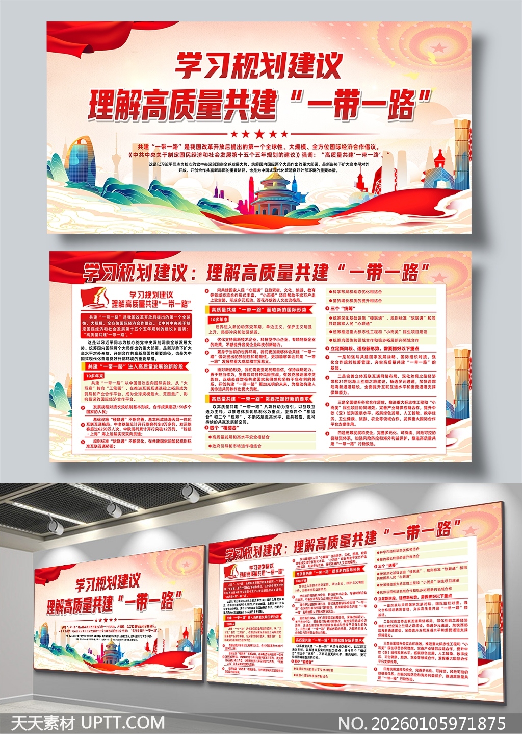 本展板设计以鲜明的红色主调与现代城市剪影融合,视觉冲击力强,内容结构清晰分模块呈现政策解读、发展成就与未来规划,采用图文并茂、重点加粗排版提升阅读效率,适用于党政机关、高校及企事业单位的政策宣传栏、主题教育展厅或会议背景墙,是高效传达“一带一路”高质量共建理念的标准化视觉工具,兼具权威性与传播力。【 素材唯一编号 20260105971875 】,展板类红色风格CDR格式素材下载,文件格式为.CDR,下载完成后的文件为一个压缩包,素材压缩包大小106.63 MB,请解压后用相应软件打开。