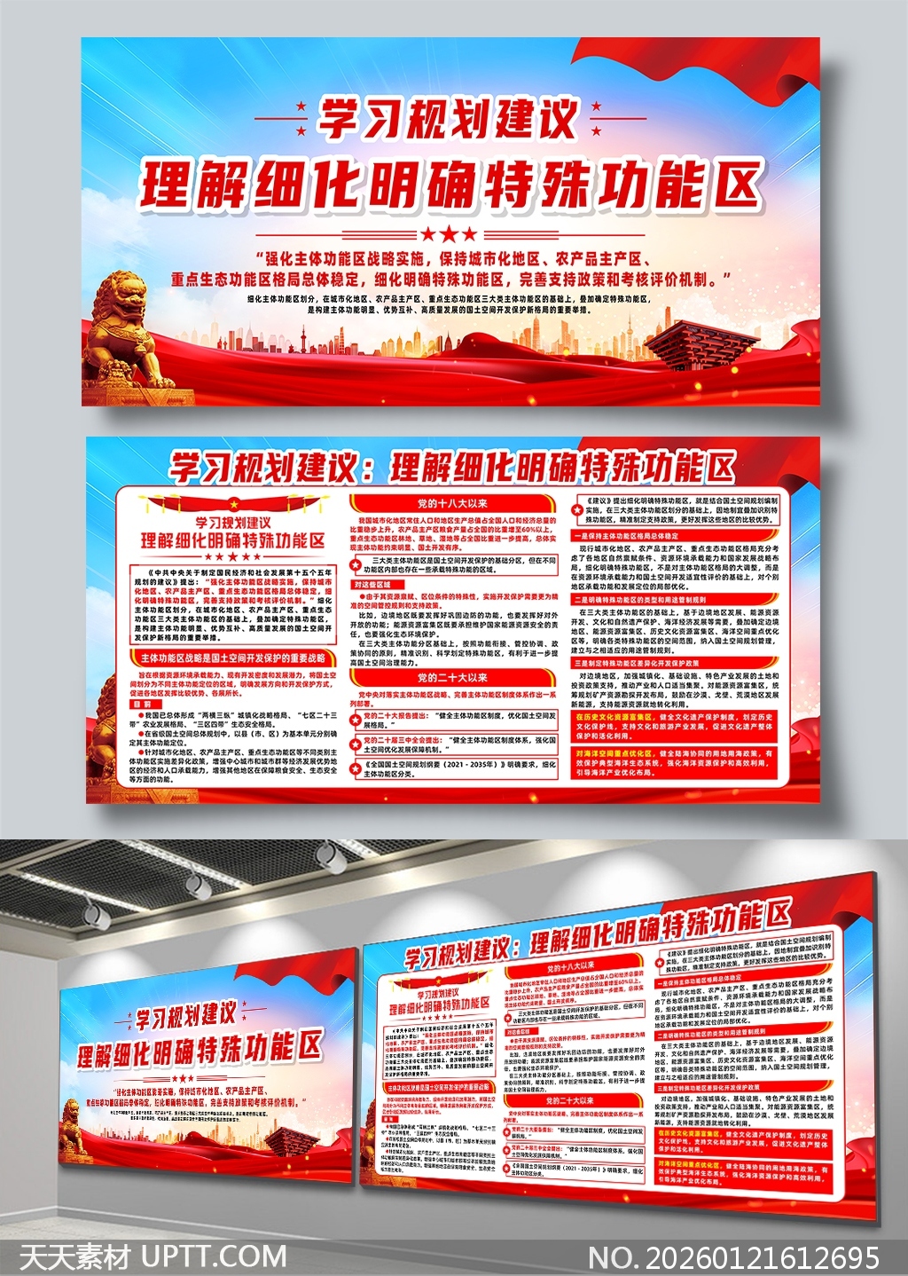 本展板模板以鲜明红蓝主色调搭配立体城市剪影与金色石狮,营造庄重而现代的视觉氛围,专为政策解读与战略规划场景设计,内容模块清晰分栏,支持多层级信息高效排布,适用于党政机关、企事业单位的学习宣传栏、会议室墙面或大型汇报现场,帮助用户直观传达“特殊功能区”等复杂概念,提升政策落地的传播力与理解度。【 素材唯一编号 20260121612695 】,展板类红色风格PSD格式素材下载,文件格式为.PSD,下载完成后的文件为一个压缩包,素材压缩包大小36.8 MB,请解压后用相应软件打开。