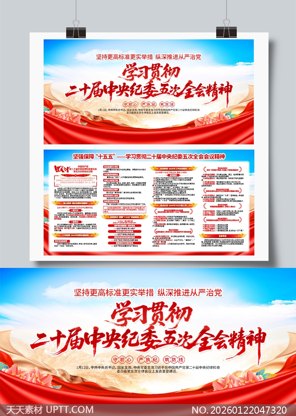 本展板设计以庄严红蓝主色调搭配飘逸绸缎与祥云元素,视觉冲击力强且富有时代感,标题采用醒目书法字体突出核心主题,内容板块清晰划分、图文并茂,涵盖会议精神要点与“守初心、严执纪、筑防线”等关键词,适用于党政机关、企事业单位及高校的宣传栏、会议室或党建文化墙展示,是开展廉政教育和政策传达的理想视觉载体,助力营造风清气正的政治生态氛围。【 素材唯一编号 20260122047320 】,展板类红色风格PSD格式素材下载,文件格式为.PSD,下载完成后的文件为一个压缩包,素材压缩包大小83.22 MB,请解压后用相应软件打开。