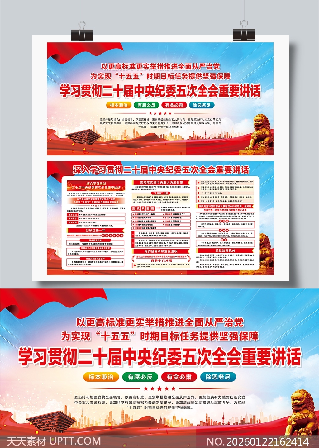 本矢量展板模板以红蓝主色调搭配金色石狮与城市剪影,庄重大气,视觉冲击力强,内容模块清晰分层,支持自由编辑文字与配色,适用于党政机关、企事业单位及高校开展二十届中央纪委五次全会精神宣传、主题党日、廉政教育等场景,是打造标准化、高辨识度党建宣传阵地的理想设计素材。【 素材唯一编号 20260122162414 】,展板类红色风格CDR格式素材下载,文件格式为.CDR,下载完成后的文件为一个压缩包,素材压缩包大小38.83 MB,请解压后用相应软件打开。
