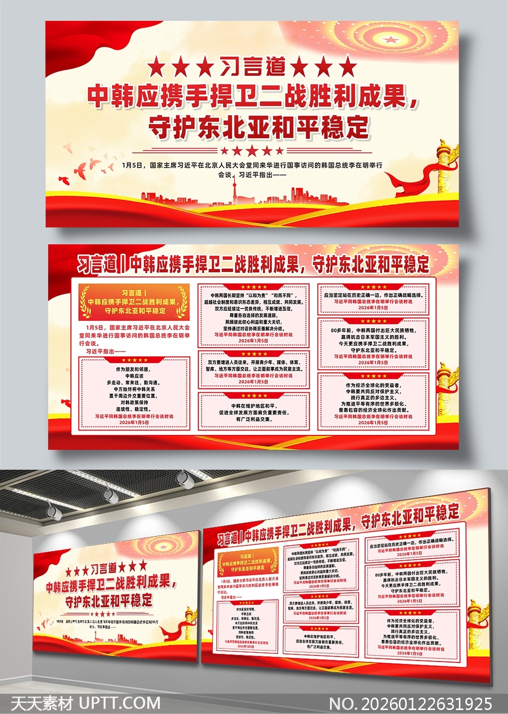 本展板以鲜明的红色主调与金色光芒营造庄重热烈氛围,融合飘扬旗帜、城市剪影与和平鸽等视觉符号,强化主题感染力;内容结构清晰,分栏呈现习主席重要讲话金句与核心观点,便于观众快速聚焦重点;适用于政府机关、高校、社区等场所的主题宣传、党建教育及国际关系展览,是传递和平理念、凝聚共识的理想视觉载体。【 素材唯一编号 20260122631925 】,展板类红色风格CDR格式素材下载,文件格式为.CDR,下载完成后的文件为一个压缩包,素材压缩包大小12.41 MB,请解压后用相应软件打开。
