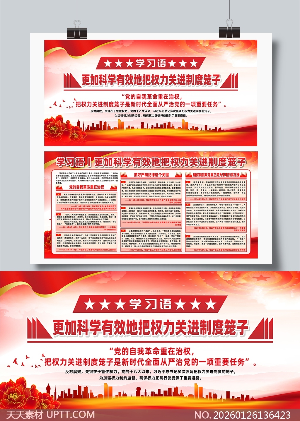 本展板采用鲜明红金主色调与城市剪影、牡丹祥云等象征元素,强化政治严肃性与时代感;标题区以五角星+立体条纹突出核心主题,正文分模块呈现“自我革命”“严明纪律”“制度保障”三大要点,引用习近平总书记重要讲话原文及具体时间节点增强权威性与实证性;版式层次清晰、图文并茂,适配党政机关、企事业单位廉政教育展厅、主题党日活动及反腐倡廉宣传周等场景,兼具思想深度与视觉感染力,便于悬挂展示与内容传播。【 素材唯一编号 20260126136423 】,展板类红色风格CDR格式素材下载,文件格式为.CDR,下载完成后的文件为一个压缩包,素材压缩包大小49.72 MB,请解压后用相应软件打开。