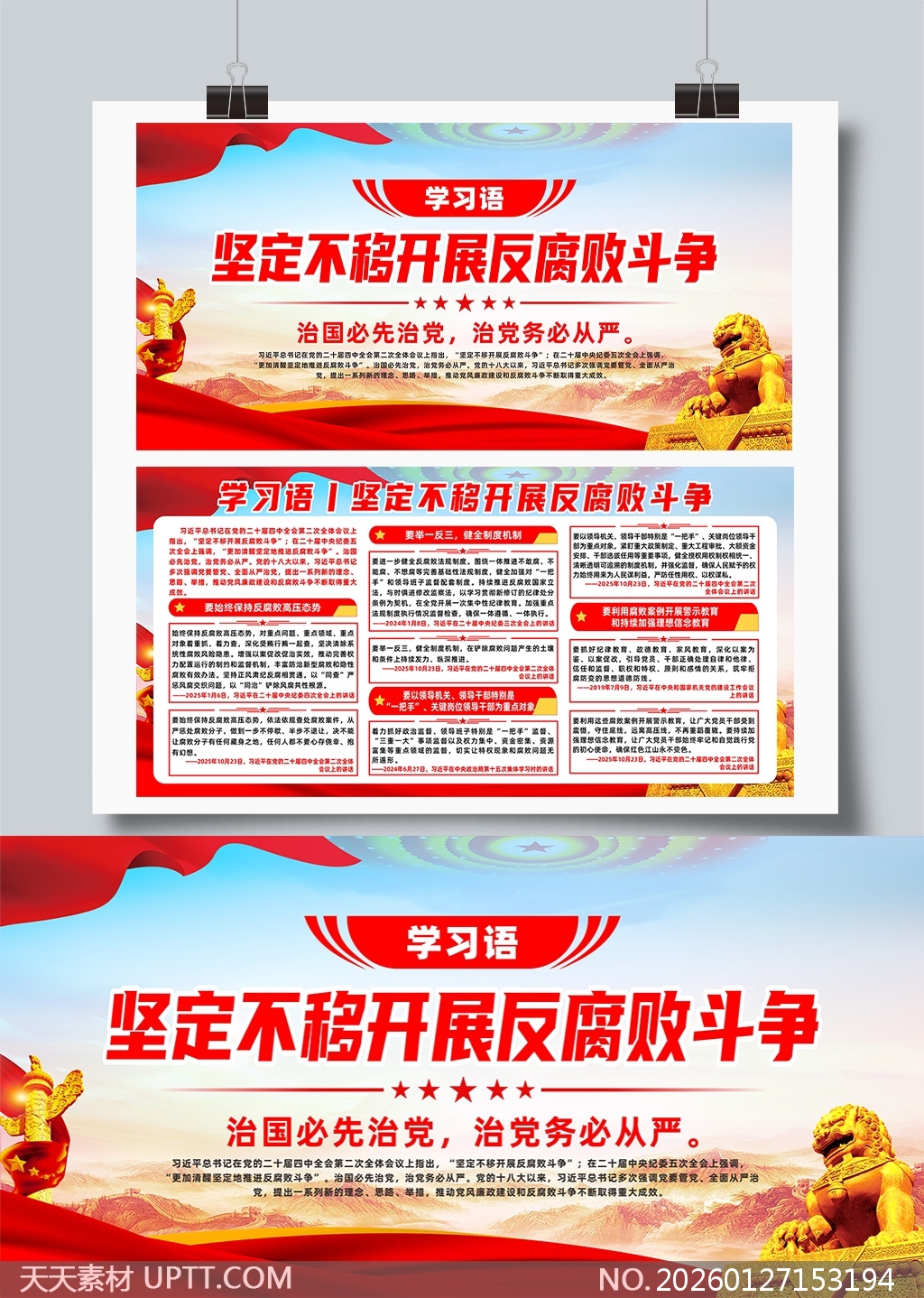 本作品以庄重红金主色调搭配华表、石狮与山河背景,凸显政治严肃性与国家象征意义,采用模块化信息排版清晰呈现“学习语”核心要义及反腐败斗争关键部署,融合权威引述、要点提炼与时间轴标注,增强内容可信度与可读性;适用于党政机关、企事业单位党建宣传栏、廉政教育展厅及主题教育活动现场布置,既满足正式场合的规范要求,又通过视觉层次与图文协同提升传播力与感染力,是开展党纪教育与廉洁文化建设的高效可视化载体。【 素材唯一编号 20260127153194 】,展板类红色风格CDR格式素材下载,文件格式为.CDR,下载完成后的文件为一个压缩包,素材压缩包大小20.65 MB,请解压后用相应软件打开。