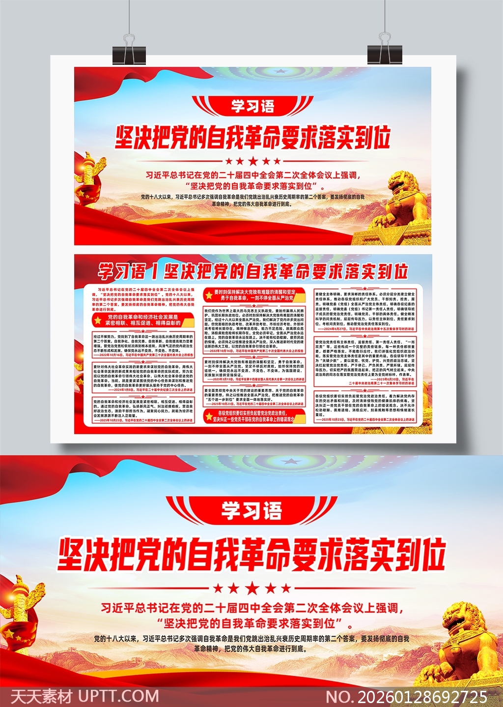 本展板设计以红金主色调彰显庄重肃穆的政治氛围,顶部飘带与华表、石狮等传统元素强化国家象征意义,主体采用模块化信息分区布局,清晰呈现习近平总书记关于“党的自我革命”核心论述及二十届四中全会精神要点,辅以星标重点、引文标注与时间轴式内容编排,提升阅读逻辑性与权威感;适用于党政机关会议室、党建文化墙、主题教育宣传栏及专题培训现场,兼具政策传达力与视觉感染力,是开展党性教育、落实全面从严治党要求的理想可视化载体。【 素材唯一编号 20260128692725 】,展板类红色风格CDR格式素材下载,文件格式为.CDR,下载完成后的文件为一个压缩包,素材压缩包大小22 MB,请解压后用相应软件打开。