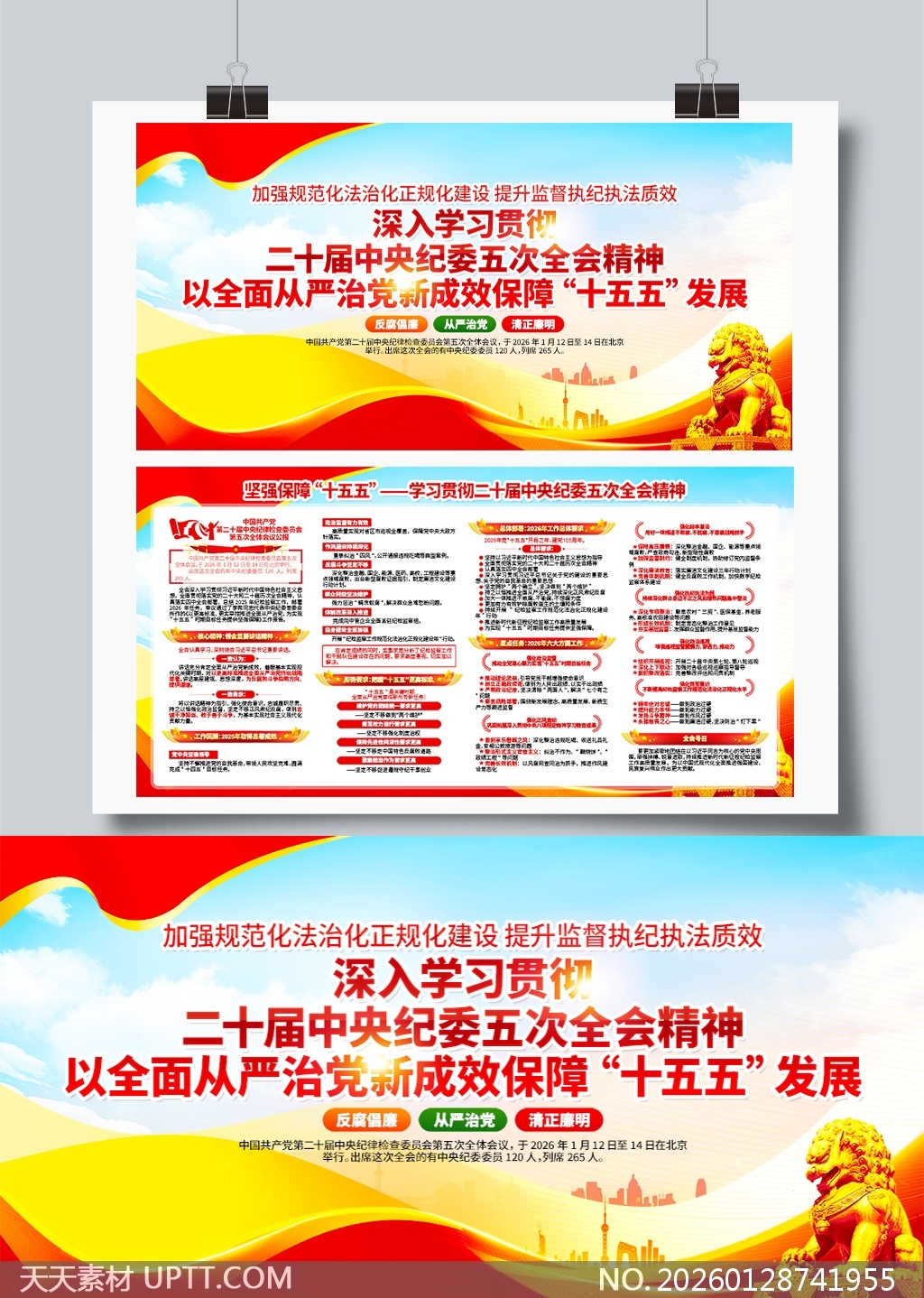 本展板设计以红金主色调彰显庄重与奋进,融合党徽、华表、石狮等政治符号与城市剪影背景,突出权威性与时代感;采用模块化信息布局,将全会核心精神、重点任务与“十五五”保障举措分层呈现,辅以图标化要点提炼与三色标签(反腐倡廉/从严治党/清正廉明)强化视觉引导;适用于党政机关、国企单位及基层党组织的专题学习宣传、会议室布置或展厅陈列,兼具政策传达力与视觉感染力,助力高效开展纪律教育与发展规划宣贯工作。【 素材唯一编号 20260128741955 】,展板类红色风格PSD格式素材下载,文件格式为.PSD,下载完成后的文件为一个压缩包,素材压缩包大小93.51 MB,请解压后用相应软件打开。