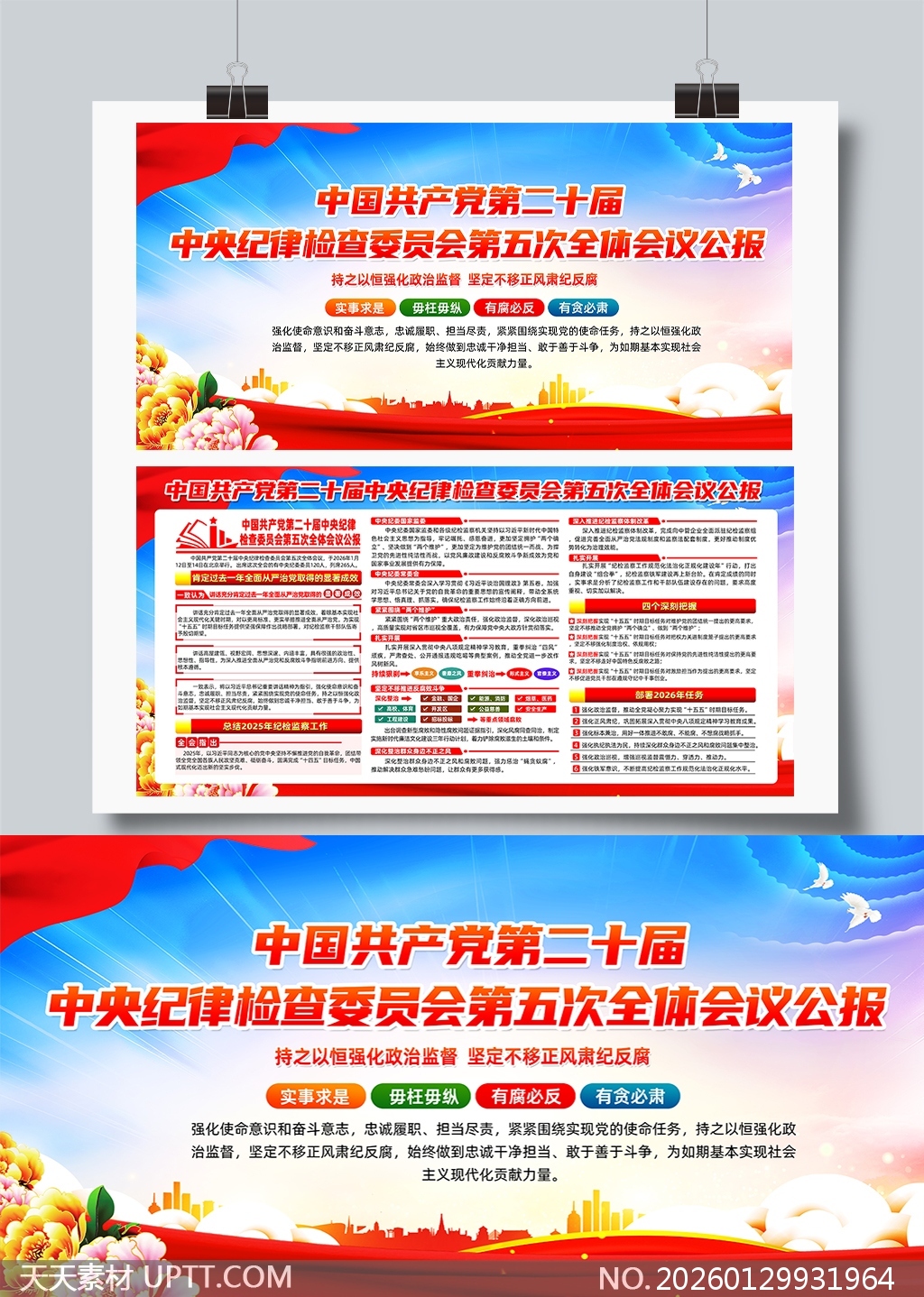 本模板采用庄重红蓝主色调搭配金色祥云与白鸽元素,视觉大气磅礴且富有政治仪式感;版式结构清晰,上部突出会议核心标题与“实事求是、毋枉毋纵”等四组关键词,中部以模块化布局呈现公报要点、工作部署与2026年任务,信息层级分明、重点突出;支持PSD分层编辑,字体、图标、色块均可灵活替换,适用于党政机关、企事业单位的会议室布置、廉政教育展厅、专题学习展陈及内部宣传栏张贴,高效助力二十届中央纪委五次全会精神的可视化传达与落地推广。【 素材唯一编号 20260129931964 】,展板类红色风格PSD格式素材下载,文件格式为.PSD,下载完成后的文件为一个压缩包,素材压缩包大小35.34 MB,请解压后用相应软件打开。
