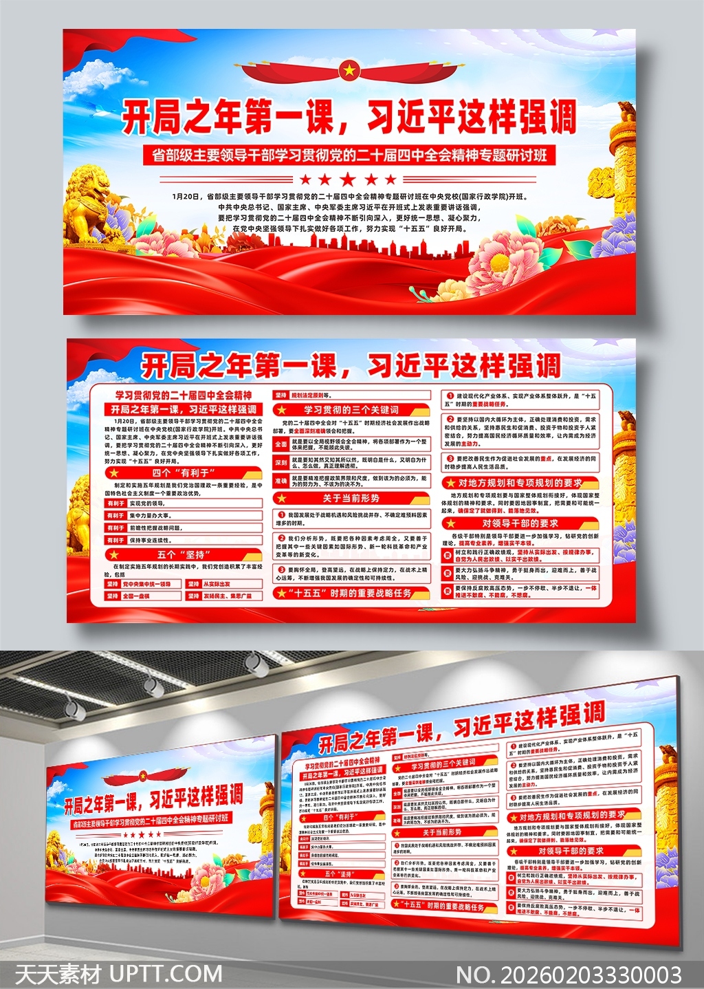 本展板设计以红金主色调彰显庄重与奋进,融合党徽、华表、祥云、石狮等象征元素,视觉层次丰富且富有政治仪式感;内容结构清晰,采用模块化排版突出“三个关键词”“四个有利于”“五个坚持”等核心要点,便于快速抓取重点;适用于党政机关、企事业单位的专题党课学习、二十届四中全会精神宣贯及年度工作部署会议现场布置,既可作墙面展陈,亦适配大型LED屏动态展示,兼具思想性、规范性与传播力。【 素材唯一编号 20260203330003 】,展板类红色风格CDR格式素材下载,文件格式为.CDR,下载完成后的文件为一个压缩包,素材压缩包大小43.61 MB,请解压后用相应软件打开。