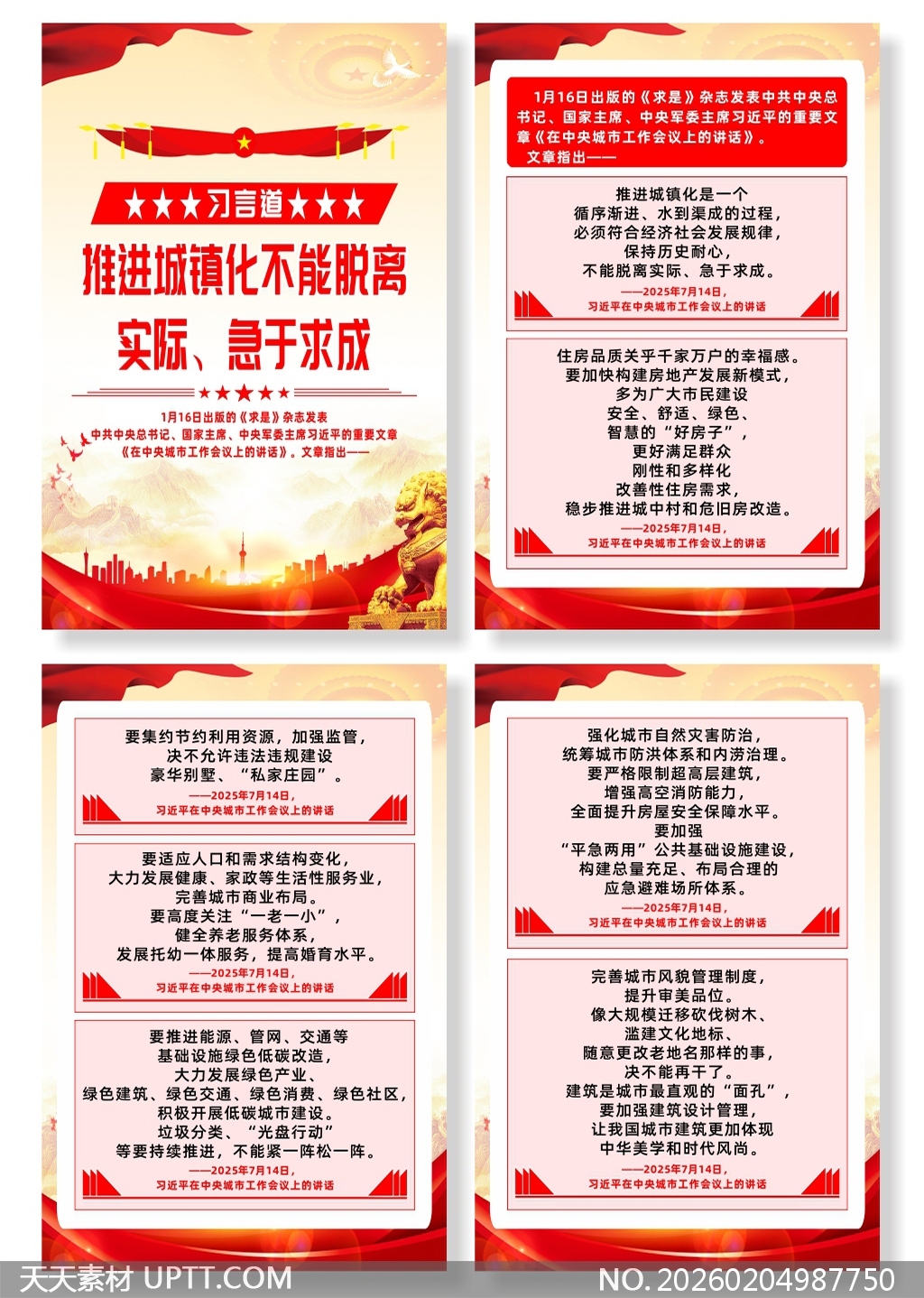 本系列海报以庄重热烈的红金主色调搭配城市剪影、华表石狮等象征元素,突出政治性与艺术性统一;采用模块化排版清晰呈现习近平总书记关于城镇化“循序渐进、实事求是”核心论述的六大要点,引用权威讲话原文并标注具体日期增强公信力;适用于党政机关宣传栏、党校培训课件、城市规划展厅及主题教育活动展陈,兼具政策传达力与视觉感染力,是开展高质量城镇化政策宣贯的理想视觉载体。【 素材唯一编号 20260204987750 】,海报类红色风格CDR格式素材下载,文件格式为.CDR,下载完成后的文件为一个压缩包,素材压缩包大小11.67 MB,请解压后用相应软件打开。