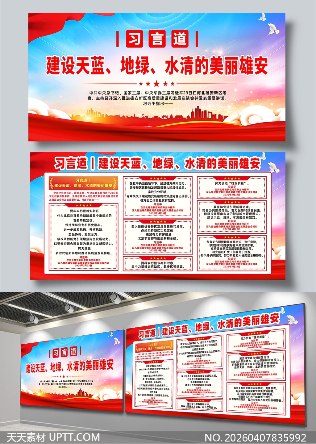 本展板设计以红蓝主色调营造庄重而富有活力的视觉氛围,顶部飘带与白鸽元素象征希望与生态和谐,城市剪影与云纹背景凸显雄安现代化与自然融合的定位;内容采用模块化排版,精选习近平总书记关于雄安新区高质量发展的重要论述,分栏呈现核心要义与实践路径,文字清晰、重点突出、逻辑严谨;适用于政府机关、社区中心、学校及企业展厅等场景的政策宣贯、主题教育与成果展示,兼具政治性、艺术性与实用性,便于印刷上墙或数字屏显传播。【 素材唯一编号 20260407835992 】,展板类红色风格CDR格式素材下载,文件格式为.CDR,下载完成后的文件为一个压缩包,素材压缩包大小35.1 MB,请解压后用相应软件打开。
