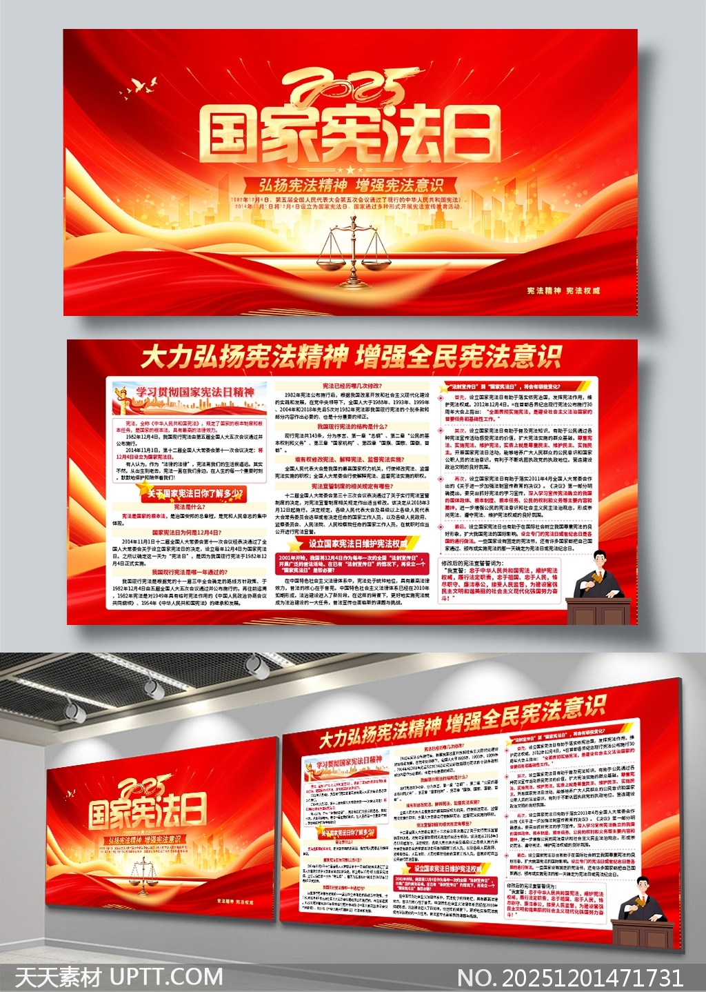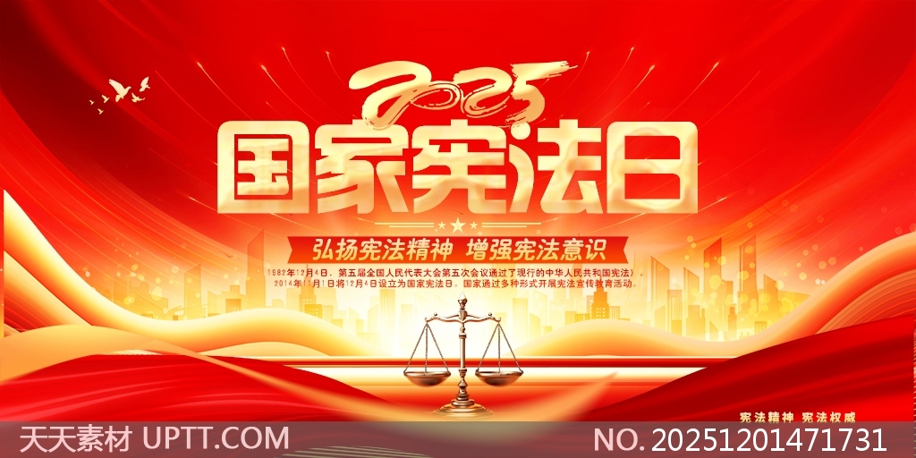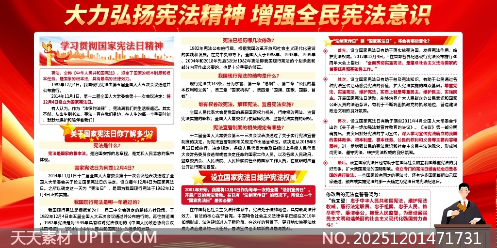 本作品以红色为主色调,融合党徽、天安门、法槌等元素,展现庄严大气的党建风格,突出2025年国家宪法日主题,设计简洁明快、层次分明,兼具视觉冲击力与宣传实效性。内容涵盖宪法发展历程、核心精神解读及普法知识普及,适用于机关单位、学校、社区等场所的法制宣传栏、展板展示或PPT汇报,助力弘扬宪法精神,增强全民法治意识,是新时代法治宣传教育的理想素材。【 素材唯一编号 20251201471731 】,展板类红色风格PSD格式素材下载,文件格式为.PSD,下载完成后的文件为一个压缩包,素材压缩包大小93.9 MB,请解压后用相应软件打开。