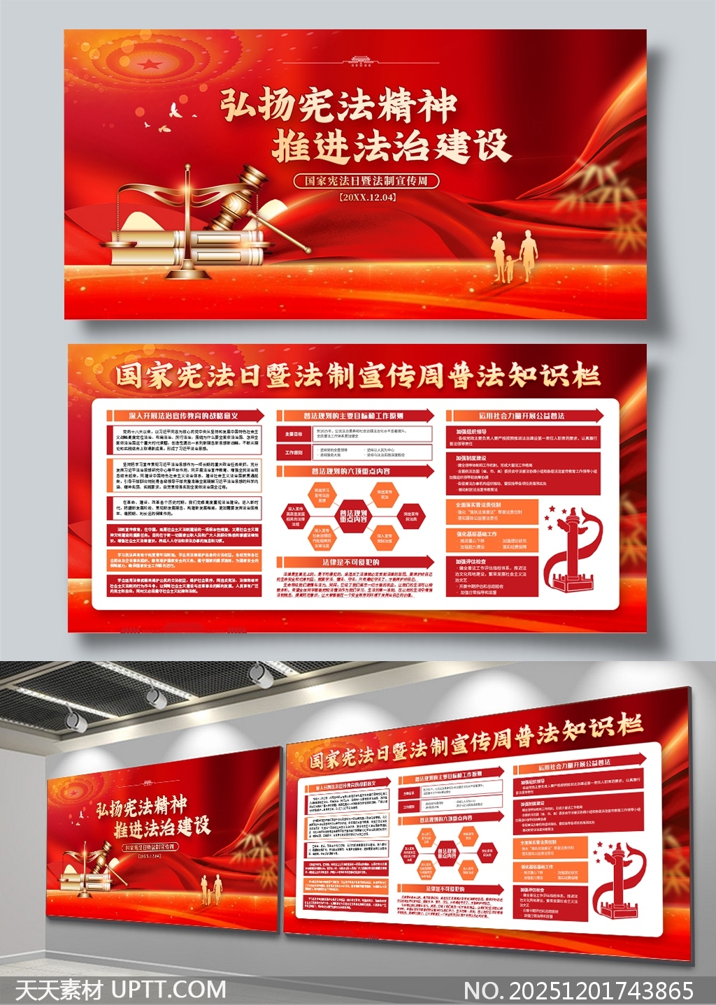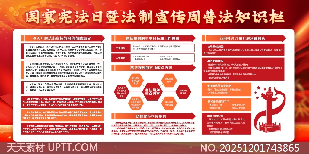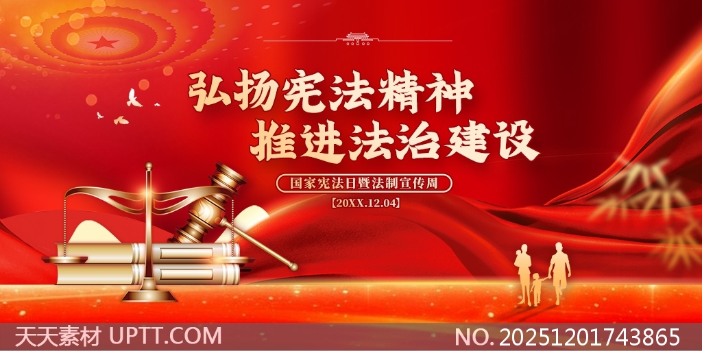 本作品以红色为主色调,融合天平、法槌、宪法徽章等法治元素,突出庄重感与权威性,整体设计大气恢弘,视觉冲击力强,内容结构清晰,涵盖宪法精神解读、普法重点、法治建设路径等核心信息,适用于机关单位、学校、社区等场所的国家宪法日及法制宣传周主题展览,兼具宣传性与教育性,助力营造尊法学法守法用法的良好氛围。【 素材唯一编号 20251201743865 】,展板类红色风格PSD格式素材下载,文件格式为.PSD,下载完成后的文件为一个压缩包,素材压缩包大小39.88 MB,请解压后用相应软件打开。