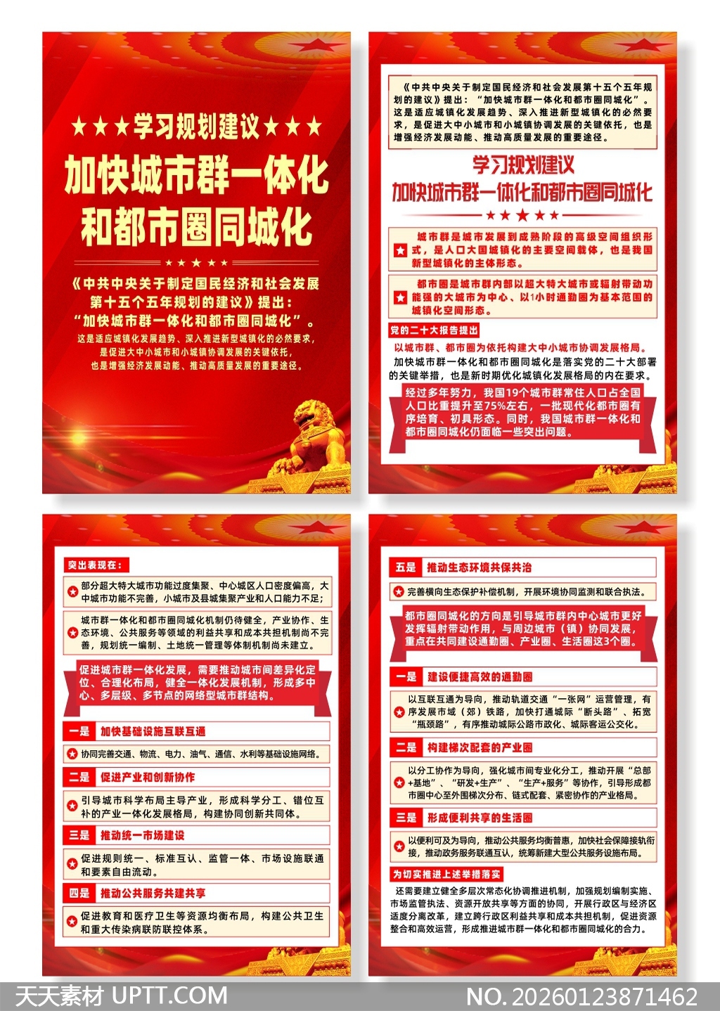 本系列宣传海报以鲜明红色主调与金色祥云、华表、石狮等传统元素融合现代排版,突出政治性与视觉感染力;内容紧扣国家“十五五”规划核心部署,系统梳理城市群一体化与都市圈同城化的战略意义、突出问题及五大实施路径,信息层级清晰、要点凝练;适用于党政机关政策宣贯、城市发展规划研讨会、党校培训及政务展厅展示等场景,兼具权威性、指导性与传播力,助力基层单位高效开展政策解读与公众动员工作。【 素材唯一编号 20260123871462 】,海报类红色风格CDR格式素材下载,文件格式为.CDR,下载完成后的文件为一个压缩包,素材压缩包大小27.08 MB,请解压后用相应软件打开。