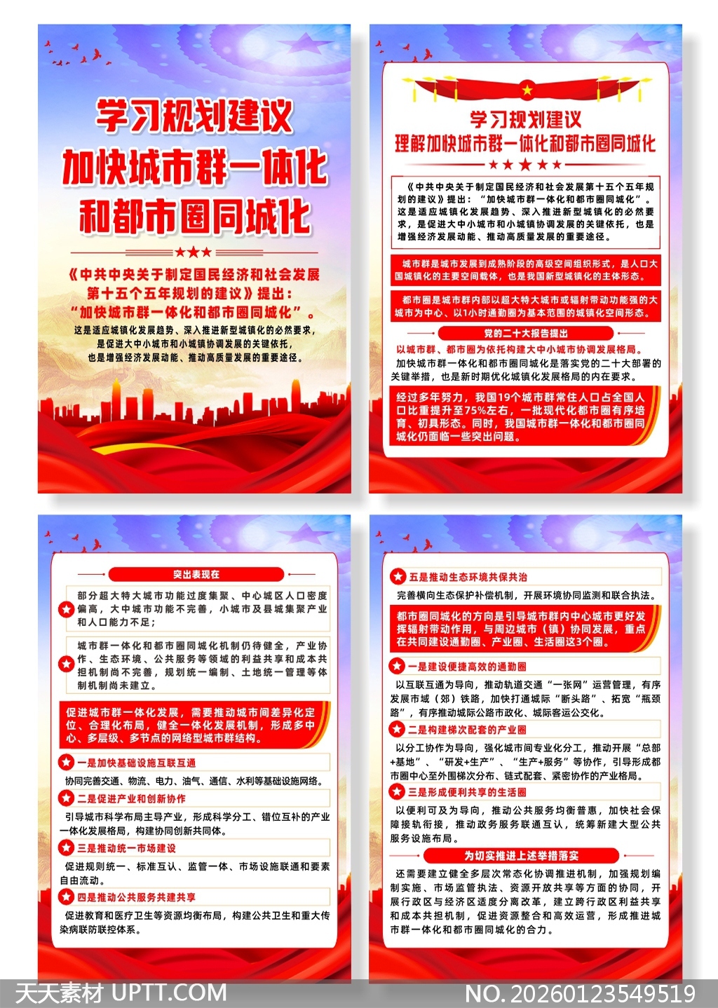 本系列海报以鲜明的红色主调与城市剪影、飘带等视觉元素,结合权威政策文本与清晰层级排版,系统呈现城市群一体化与都市圈同城化的核心要义及实施路径,兼具政治高度与信息密度,适用于政府机关、规划院所、高校课堂及大型会议等场景,是开展政策宣导、专题学习与成果展示的理想视觉载体,助力高效传达国家战略部署。【 素材唯一编号 20260123549519 】,海报类红色风格CDR格式素材下载,文件格式为.CDR,下载完成后的文件为一个压缩包,素材压缩包大小34.62 MB,请解压后用相应软件打开。