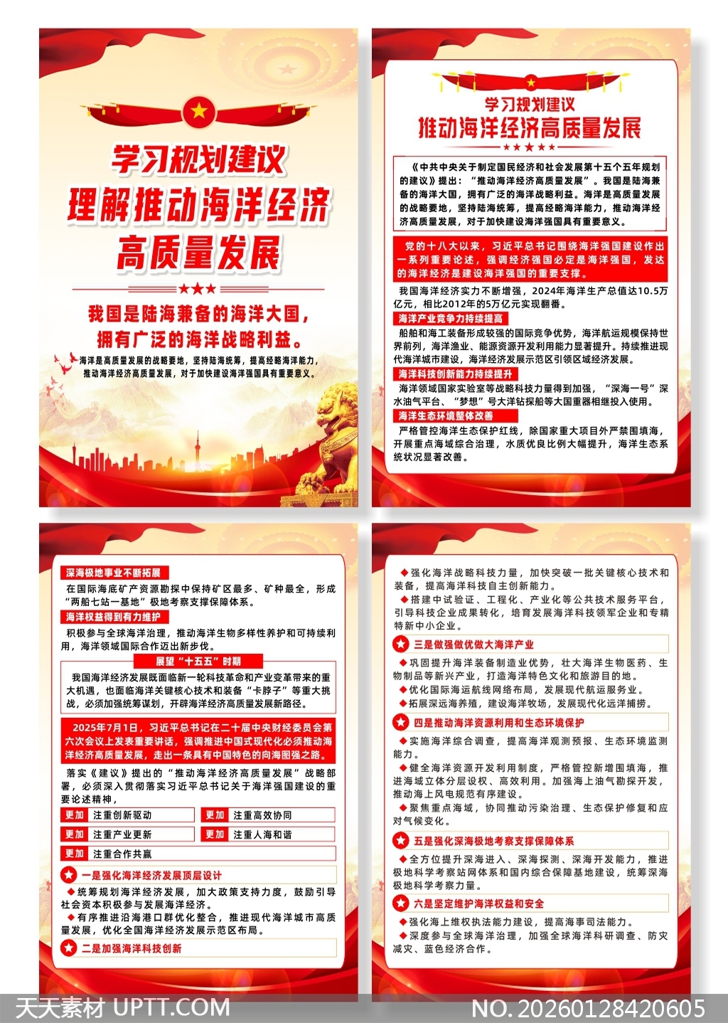 本模板采用鲜明红色主调与金色元素融合的党政风格设计,结合海浪、华表、城市剪影等视觉符号,凸显庄重性与时代感;内容结构清晰,涵盖战略解读、政策要点、六大重点任务及“十五五”展望,图文并茂、层次分明,支持一键替换数据与标题;适用于党政机关、高校院所、国企单位开展海洋经济专题学习、政策宣讲、工作汇报及干部培训等场景,兼具政治高度、专业深度与实用便捷性,助力高效传达高质量发展核心要义。【 素材唯一编号 20260128420605 】,海报类红色风格CDR格式素材下载,文件格式为.CDR,下载完成后的文件为一个压缩包,素材压缩包大小12.5 MB,请解压后用相应软件打开。