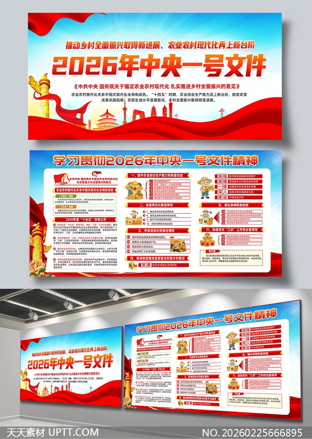 本展板以红蓝主色调彰显政治庄重与时代活力,融合天安门、华表、麦穗等象征元素及卡通农民形象,图文并茂梳理2026年中央一号文件六大核心要点与实践路径,采用模块化分区设计便于快速抓取关键政策;适用于党政机关宣传栏、乡村振兴培训会场、基层党群服务中心及农业博览会等场景,兼具权威性、可读性与视觉感染力,助力政策精准传达与落地转化。【 素材唯一编号 20260225666895 】,展板类红色风格PSD格式素材下载,文件格式为.PSD,下载完成后的文件为一个压缩包,素材压缩包大小87.8 MB,请解压后用相应软件打开。