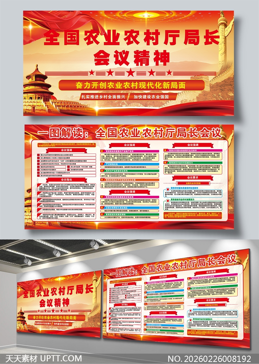 本作品以恢弘的红色主调与金色祥云、天安门、华表等象征性元素营造庄重热烈的政治氛围,采用“标题+导语+模块化信息图解”结构,清晰呈现会议核心精神与重点任务,内容分区逻辑严谨、图文并茂,支持高清打印与展板落地展示;适用于农业农村系统内部宣贯、政务展厅陈列、基层单位学习墙及专题培训现场布置,兼具政策传达力、视觉感染力与实操适配性,是高效落实会议精神的标准化视觉传播载体。【 素材唯一编号 20260226008192 】,展板类红色风格PSD格式素材下载,文件格式为.PSD,下载完成后的文件为一个压缩包,素材压缩包大小98.77 MB,请解压后用相应软件打开。