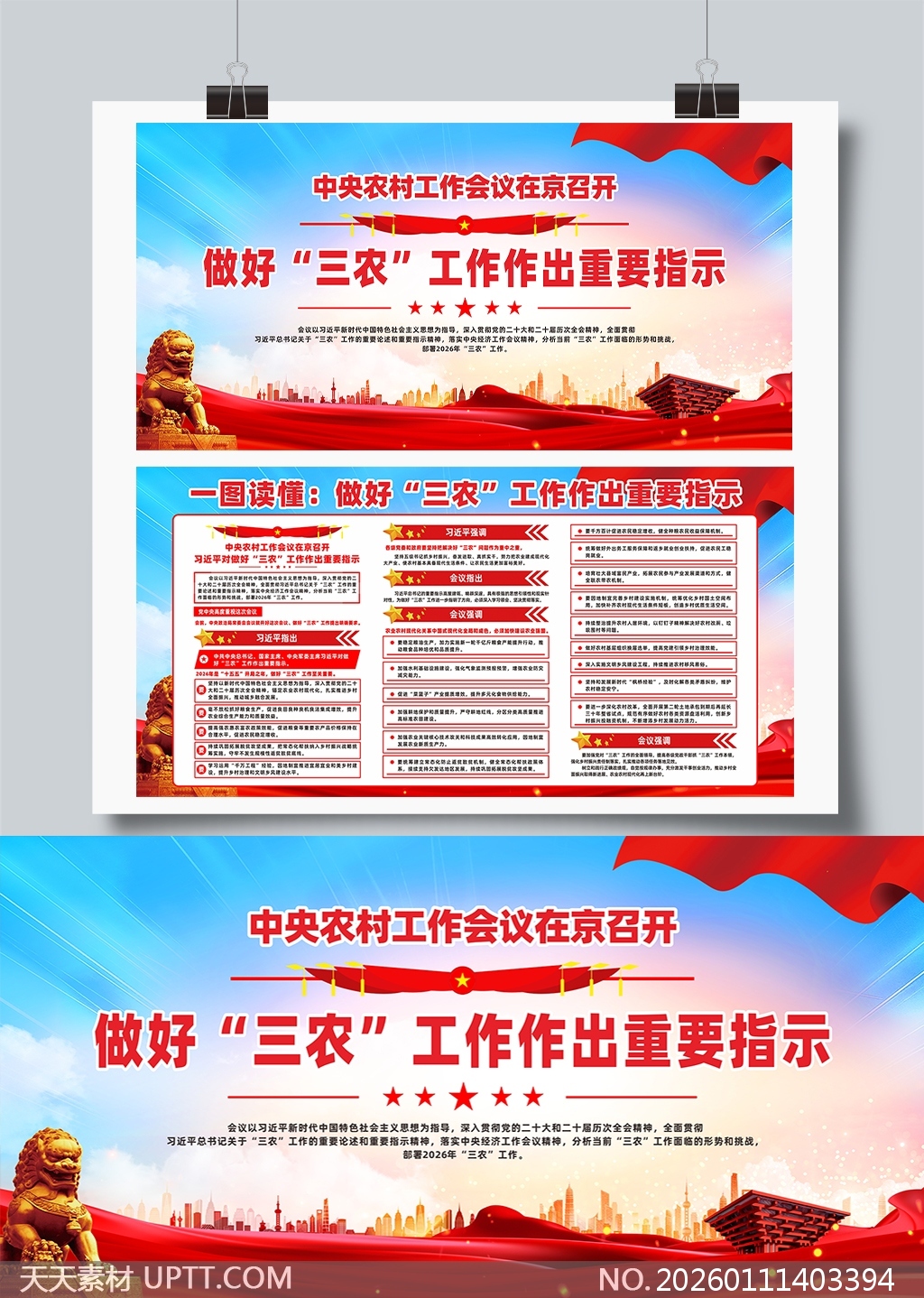 本展板以红蓝主色调搭配金色祥云与石狮元素,庄重大气,视觉冲击力强,采用“一图读懂”结构清晰拆解中央农村工作会议核心精神,内容涵盖政策要点、工作部署与战略方向,适用于党政机关、乡镇街道、农业部门等场景的政策宣传、会议展示及文化墙布置,是高效传达“三农”工作重要指示的理想视觉载体。【 素材唯一编号 20260111403394 】,展板类红色风格CDR格式素材下载,文件格式为.CDR,下载完成后的文件为一个压缩包,素材压缩包大小36.13 MB,请解压后用相应软件打开。
