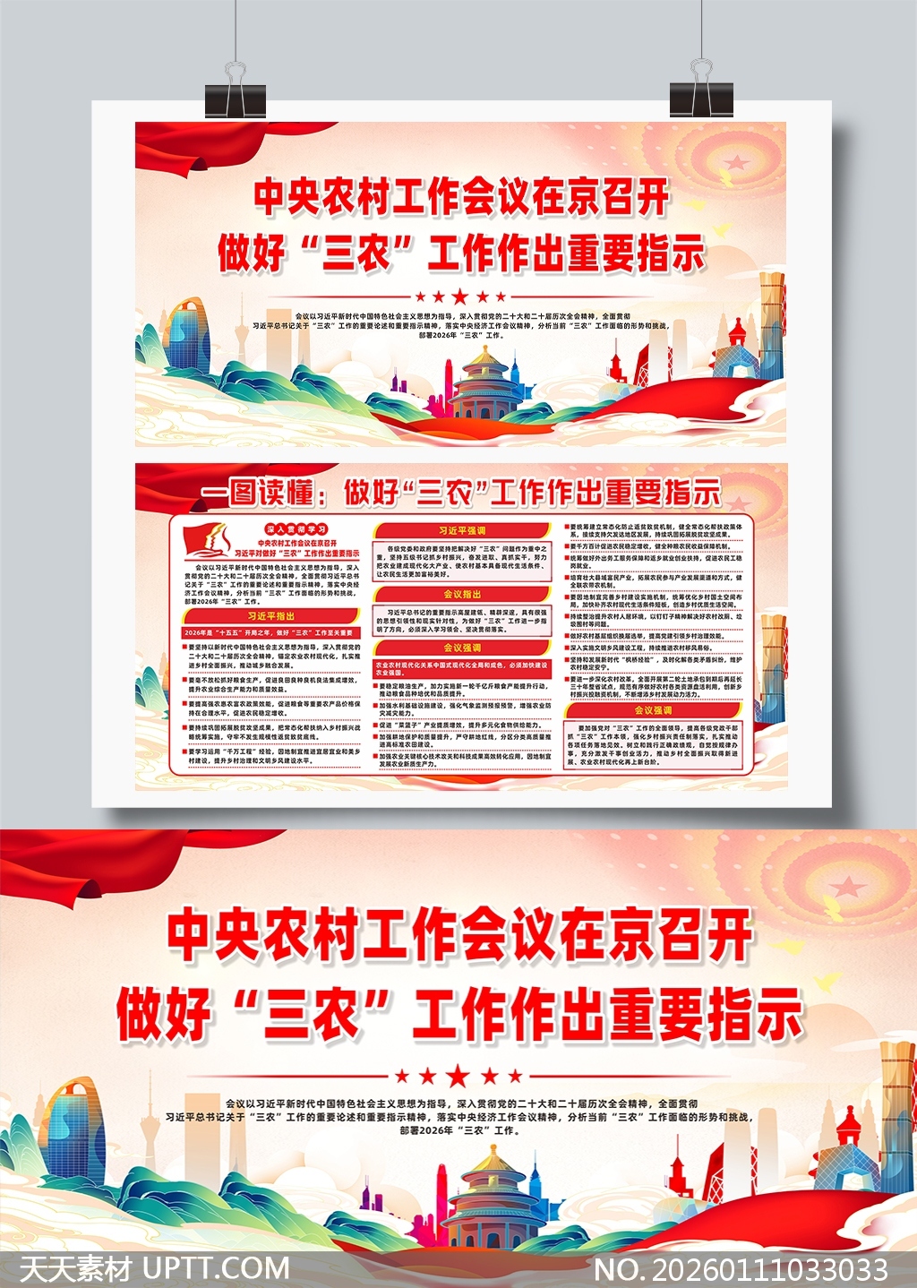 本展板以鲜明的红色主调与现代插画风格融合,视觉冲击力强,内容结构清晰,通过“一图读懂”形式将中央农村工作会议核心精神与“三农”工作重要指示提炼为模块化图文,便于快速理解与传播;适用于党政机关、乡镇街道、农业部门的政策宣传栏、会议现场及党建文化墙等场景,是高效传达国家战略、凝聚基层共识的理想视觉载体。【 素材唯一编号 20260111033033 】,展板类红色风格CDR格式素材下载,文件格式为.CDR,下载完成后的文件为一个压缩包,素材压缩包大小106.08 MB,请解压后用相应软件打开。