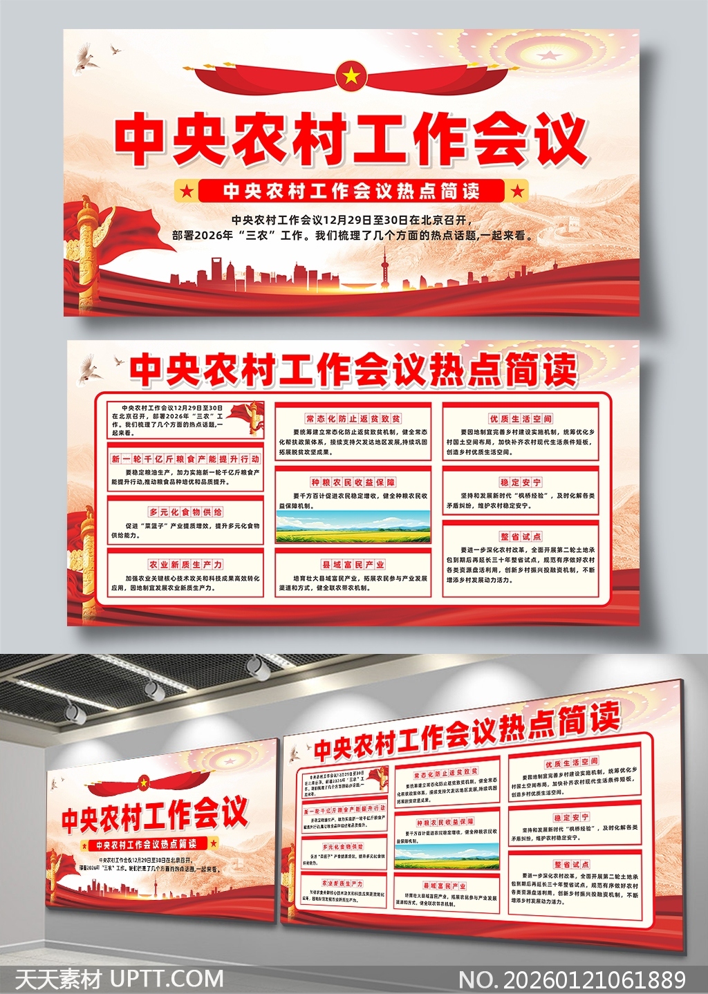 本展板以鲜明的红色主调与金色元素营造庄重热烈氛围,融合天安门、麦浪、城市剪影等视觉符号,直观呈现中央农村工作会议核心议题;内容模块化排布清晰易读,适配党政机关宣传栏、乡村振兴展厅及政策解读会议等场景,是高效传达“三农”战略要点、提升公众认知的理想视觉载体。【 素材唯一编号 20260121061889 】,展板类红色风格CDR格式素材下载,文件格式为.CDR,下载完成后的文件为一个压缩包,素材压缩包大小40.67 MB,请解压后用相应软件打开。