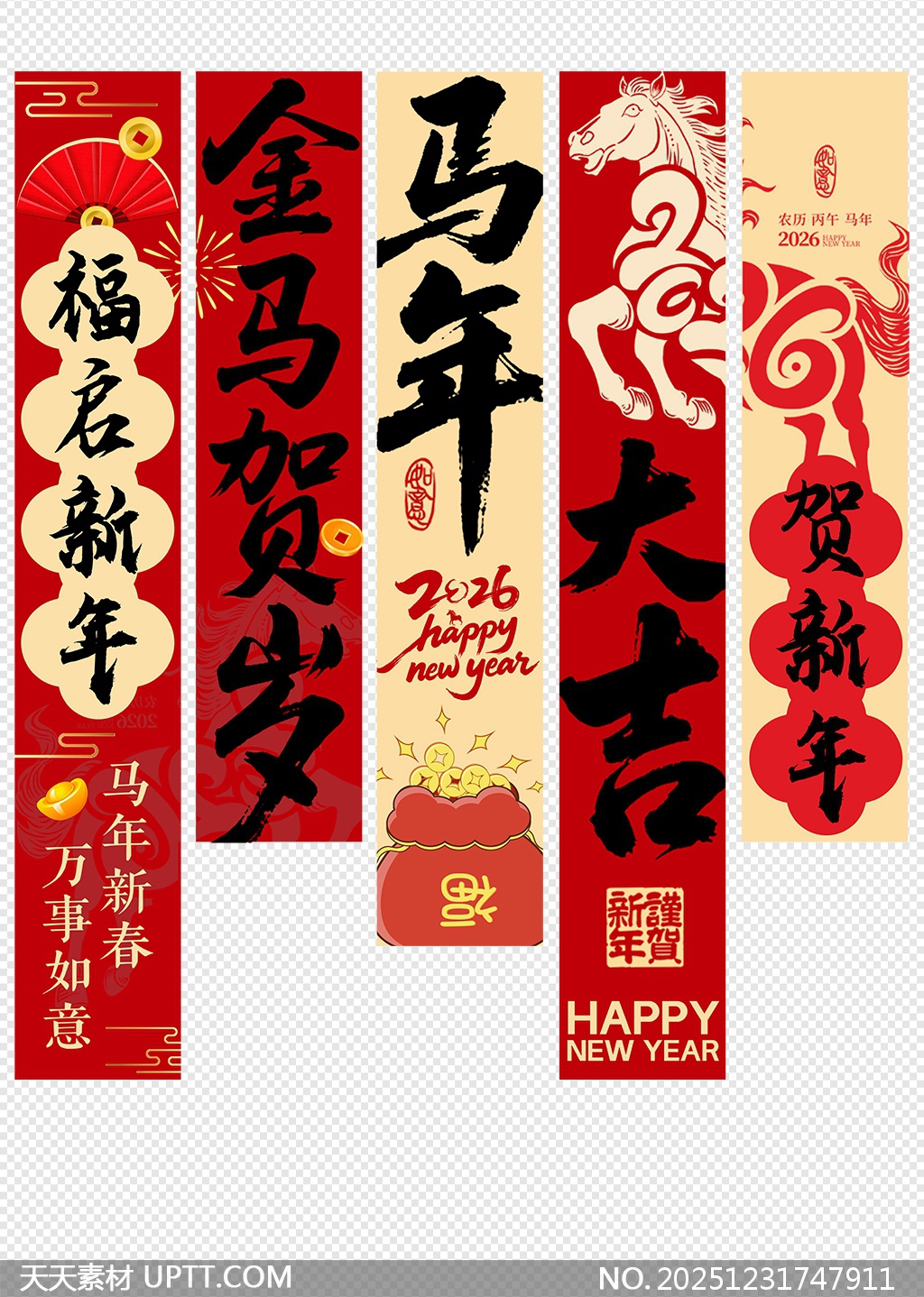 这套2026马年新春挂布条幅吊旗设计融合传统书法与现代视觉元素,以喜庆红金配色为主调,巧妙融入骏马图腾、福袋铜钱等吉祥符号,搭配“金马贺岁”“大吉”“万事如意”等祝福语,既彰显生肖年份特色又传递浓郁年味,适用于商场橱窗、店铺门头、企业大厅及家庭客厅等场景,轻松营造热烈祥瑞的节日氛围,是新年装饰与品牌造势的理想视觉素材。【 素材唯一编号 20251231747911 】,美陈类红色风格PSD格式素材下载,文件格式为.PSD,下载完成后的文件为一个压缩包,素材压缩包大小25.38 MB,请解压后用相应软件打开。