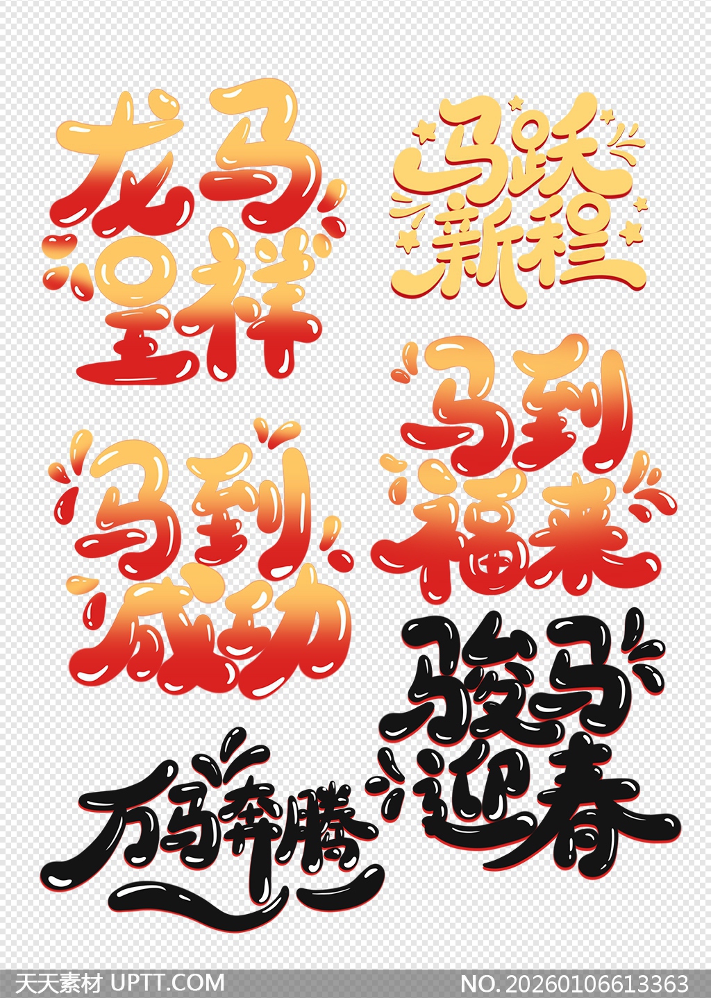本套新春艺术字设计以“马”为主题,融合龙马精神与吉祥寓意,采用饱满的渐变色彩与立体液态造型,视觉冲击力强且充满节日喜庆氛围,字体风格活泼灵动、笔画圆润富有动感,适用于春节海报、贺卡、社交媒体配图、企业年会背景及各类节庆宣传物料,轻松提升设计质感,为新年活动注入蓬勃活力与美好祝福。【 素材唯一编号 20260106613363 】,艺术字类红色风格PSD格式素材下载,文件格式为.PSD,下载完成后的文件为一个压缩包,素材压缩包大小16.3 MB,请解压后用相应软件打开。