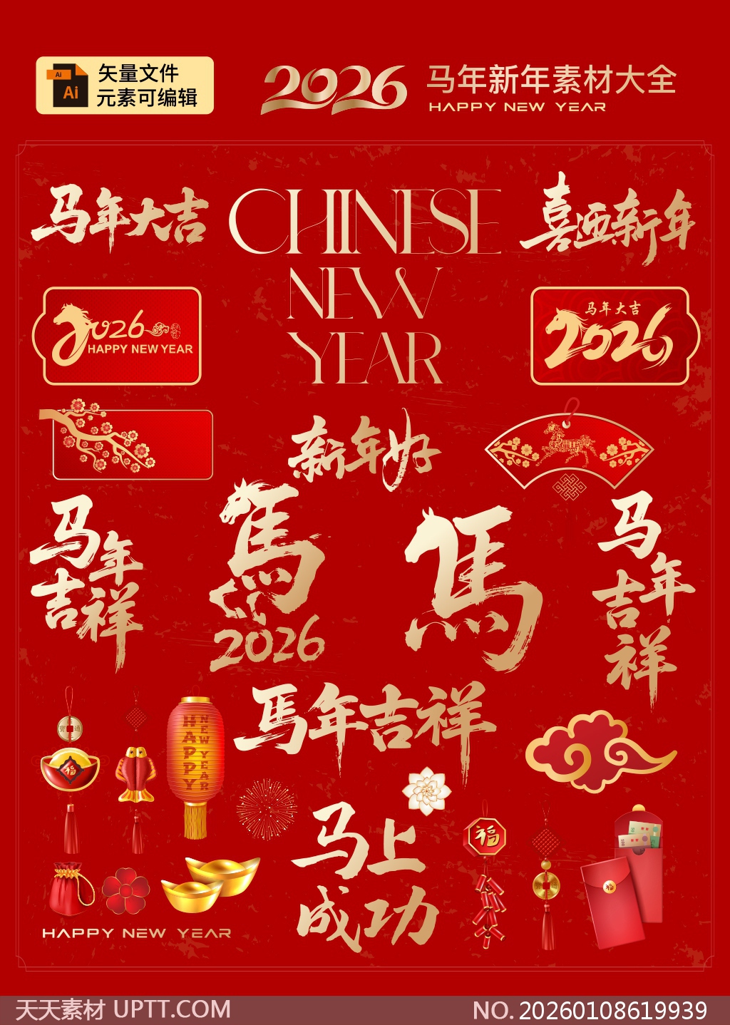 本套2026马年主题艺术字合集以喜庆红金配色为主,融合传统书法与现代设计风格,包含“马年大吉”“马上成功”“马年吉祥”等吉祥语及生肖马、灯笼、红包、祥云等节日元素,支持AI矢量编辑,适用于新年海报、贺卡、电商Banner、社交媒体配图及企业宣传物料,助您轻松打造充满年味与创意的视觉内容,为新春营销增添亮眼亮点。【 素材唯一编号 20260108619939 】,艺术字类红色风格AI格式素材下载,文件格式为.AI,下载完成后的文件为一个压缩包,素材压缩包大小5.97 MB,请解压后用相应软件打开。