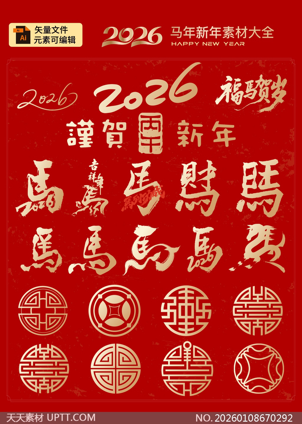 本套2026马年贺岁艺术字合集融合传统书法笔韵与现代设计语言,涵盖“福”“马”“贺岁”“新年”等吉祥主题字体及经典团寿纹样,金红配色喜庆大气,矢量AI格式支持自由编辑,适用于春节海报、贺卡、H5页面、电商Banner及线下装饰等多种场景,助力品牌快速打造高辨识度的节日视觉内容,传递新春祝福与文化温度。【 素材唯一编号 20260108670292 】,艺术字类红色风格AI格式素材下载,文件格式为.AI,下载完成后的文件为一个压缩包,素材压缩包大小4.62 MB,请解压后用相应软件打开。