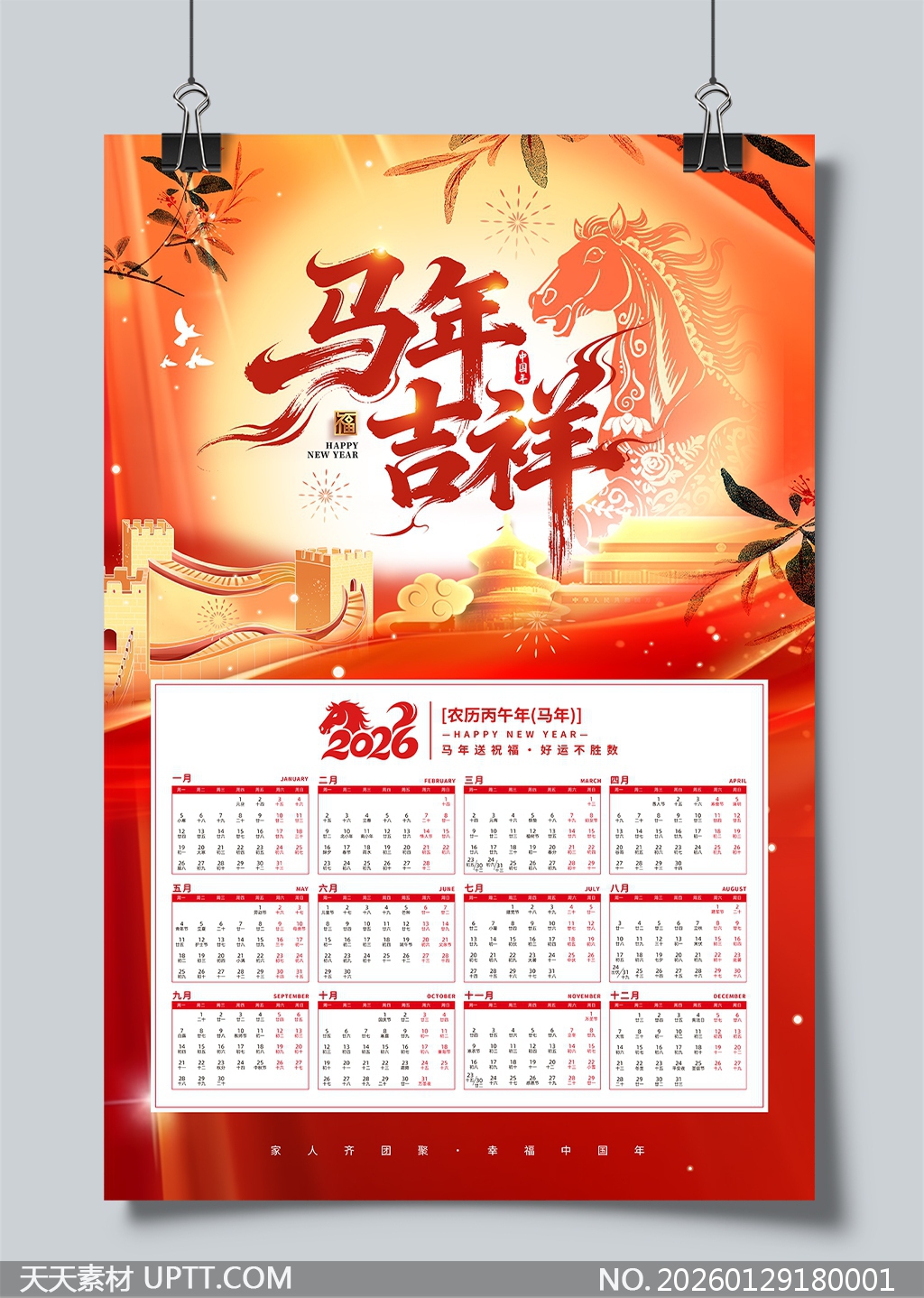本作品以热烈红金配色营造浓郁节庆氛围,融合传统国风元素如祥云、长城、飞鸟与手绘骏马图腾,书法“马年吉祥”大气磅礴,底部十二个月历排版清晰规整,兼顾实用性与艺术性;适用于企业新年礼品定制、机关单位挂历印刷、文化机构宣传品及家庭桌面装饰,既承载丙午马年祝福寓意,又彰显中华传统文化底蕴与现代设计美感,是兼具收藏价值与日常使用功能的高品质年历素材。【 素材唯一编号 20260129180001 】,日历类红色风格PSD格式素材下载,文件格式为.PSD,下载完成后的文件为一个压缩包,素材压缩包大小117.05 MB,请解压后用相应软件打开。