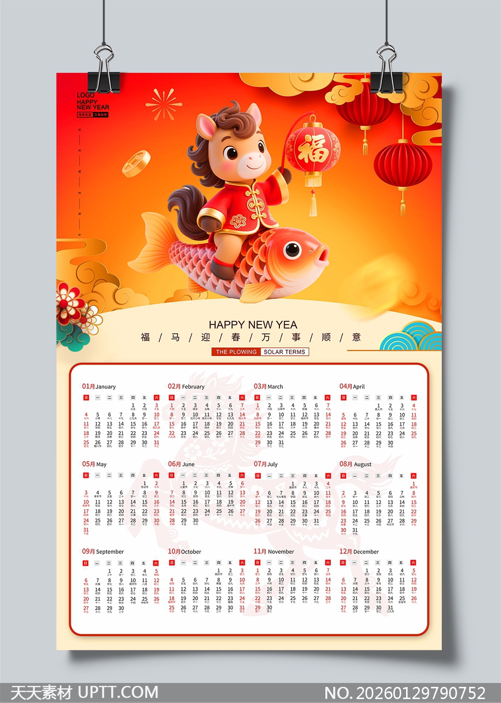 该年历以3D立体插画呈现福马骑鲤的经典吉祥意象,融合红金主色调与剪纸云纹、灯笼、铜钱等传统元素,营造喜庆祥瑞的春节氛围;上半部生动形象寓意“马上有福”“年年有余”,下半部为清晰规整的2026全年日历,标注节气与重要节日,兼具艺术性与实用性,适用于企业新年礼品、家居装饰、办公桌面摆设或文化机构宣传物料,既传递美好祝福又满足日常时间管理需求。【 素材唯一编号 20260129790752 】,日历类红色风格PSD格式素材下载,文件格式为.PSD,下载完成后的文件为一个压缩包,素材压缩包大小24.12 MB,请解压后用相应软件打开。
