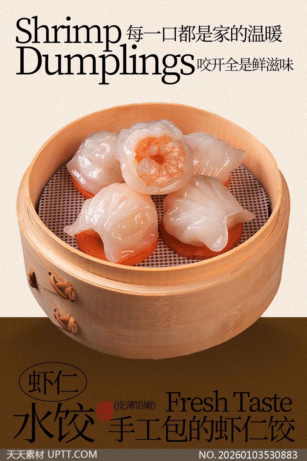 这款虾仁水饺美食海报以高清实拍呈现晶莹剔透的饺子与饱满虾仁,搭配温润木质蒸笼营造家常温馨感,中英双语文案“每一口都是家的温暖”直击情感共鸣,适用于餐饮品牌菜单、外卖平台首页、节庆促销海报及社交媒体种草图文,是提升食欲转化率的视觉利器,轻松传递手工现包、皮薄馅嫩的新鲜美味主张。【 素材唯一编号 20260103530883 】,海报类黄色风格PSD格式素材下载,文件格式为.PSD,下载完成后的文件为一个压缩包,素材压缩包大小11.32 MB,请解压后用相应软件打开。