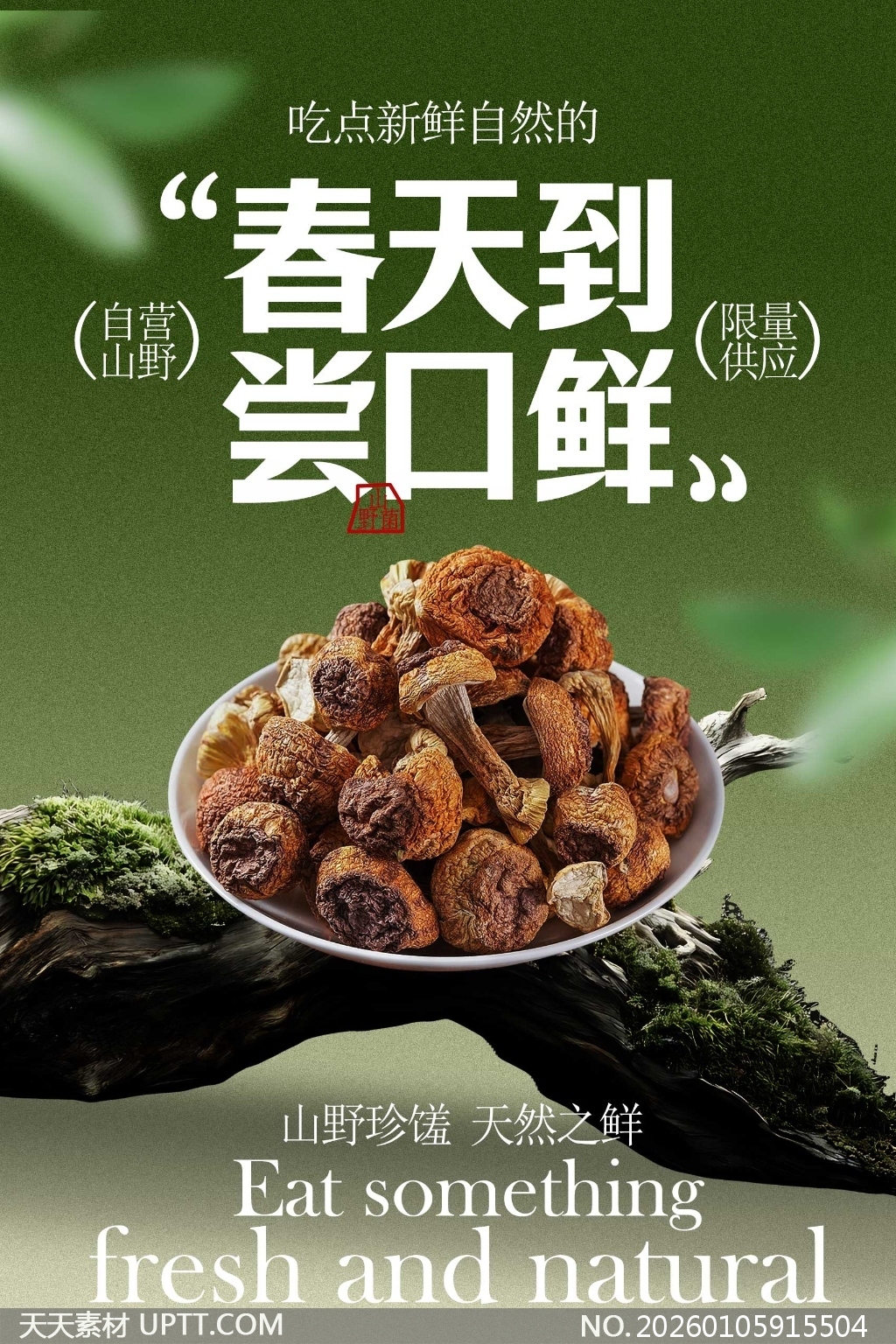 这款春季野山菌主题海报以浓郁自然绿为基调,搭配质感十足的干菌特写与苔藓木桩场景,营造出山野原生态的视觉冲击力;大字标题“春天到尝口鲜”直击味蕾,辅以“自营山野”“限量供应”等标签强化稀缺感与品质背书,中英双语文案兼顾本土与国际受众,适用于餐饮品牌春季上新、电商平台促销或健康生活类内容营销,是传递时令美味与天然理念的绝佳视觉素材。【 素材唯一编号 20260105915504 】,海报类绿色风格PSD格式素材下载,文件格式为.PSD,下载完成后的文件为一个压缩包,素材压缩包大小35.06 MB,请解压后用相应软件打开。