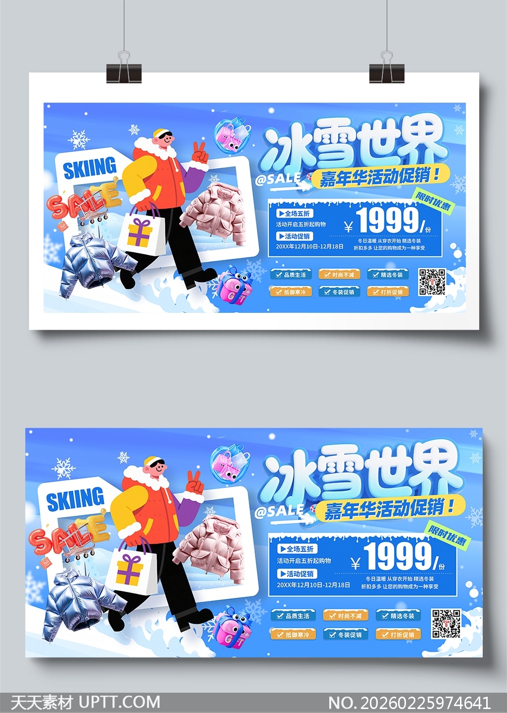 本展板采用清新蓝白主色调搭配活泼插画风格,以卡通人物、滑雪元素与冬装商品营造沉浸式冰雪氛围,视觉层次丰富且信息分区清晰;左侧动态构图增强吸引力,右侧突出“全场五折”“1999元/份”等促销核心,辅以二维码与多标签标签强化转化路径;适用于商场橱窗、品牌快闪店、线上活动页及线下推广物料,兼顾节日营销与季节性消费引导,兼具设计美感与实用传播力。【 素材唯一编号 20260225974641 】,展板类蓝色风格PSD格式素材下载,文件格式为.PSD,下载完成后的文件为一个压缩包,素材压缩包大小53.31 MB,请解压后用相应软件打开。