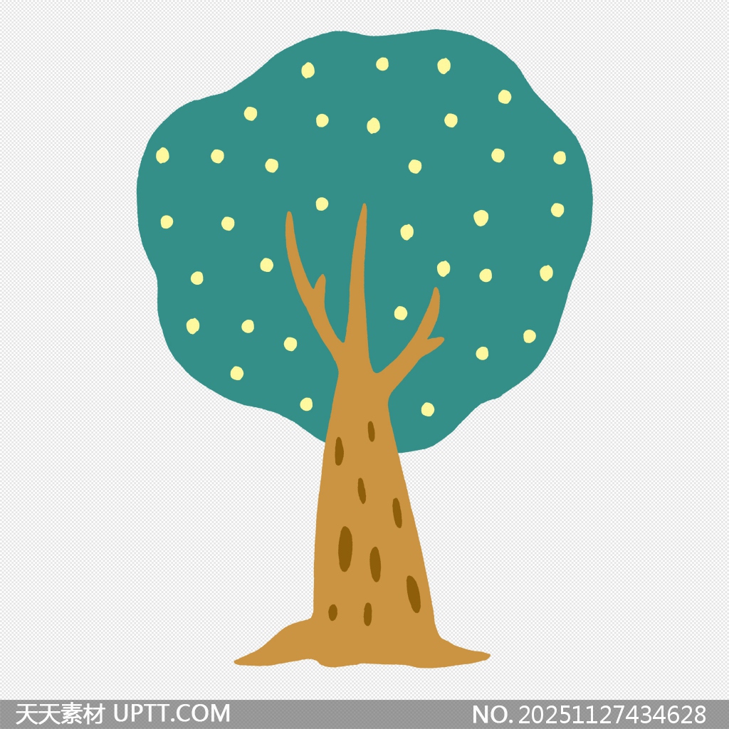 这是一幅风格清新可爱的卡通树形插画,以深绿色树冠搭配点缀其间的黄色小圆点,营造出星空般的梦幻视觉效果,树干采用自然棕色调并带有斑点纹理,整体设计简洁生动,富有童趣与想象力。适用于儿童绘本、教育课件、节日海报、PPT背景及各类创意设计项目中,为作品增添温馨浪漫的氛围,是提升视觉表现力的理想素材选择。【 素材唯一编号 20251127434628 】,插画类绿色风格PNG格式素材下载,文件格式为.PNG,下载完成后的文件为一个压缩包,素材压缩包大小160.11 KB,请解压后用相应软件打开。