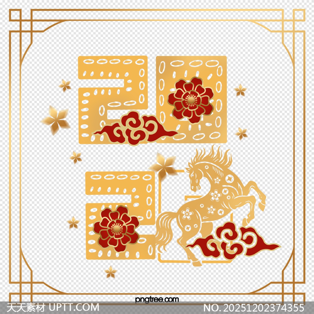 本素材以金色骏马与祥云为主题,融合传统剪纸风格与现代设计元素,呈现2026年生肖马的吉祥寓意,整体采用高质感金色搭配喜庆红色,视觉层次丰富,免抠透明背景便于灵活应用。适用于春节贺卡、海报设计、节日装饰、PPT美化及电商促销等场景,轻松提升作品节日氛围与文化韵味,是新年创意设计的理想选择。【 素材唯一编号 20251202374355 】,剪纸类黄色风格PSD格式素材下载,文件格式为.PSD,下载完成后的文件为一个压缩包,素材压缩包大小3.67 MB,请解压后用相应软件打开。